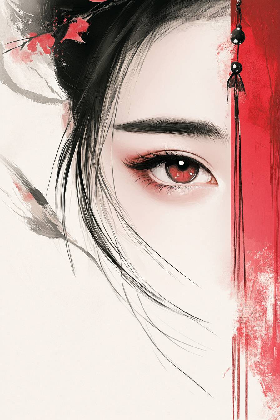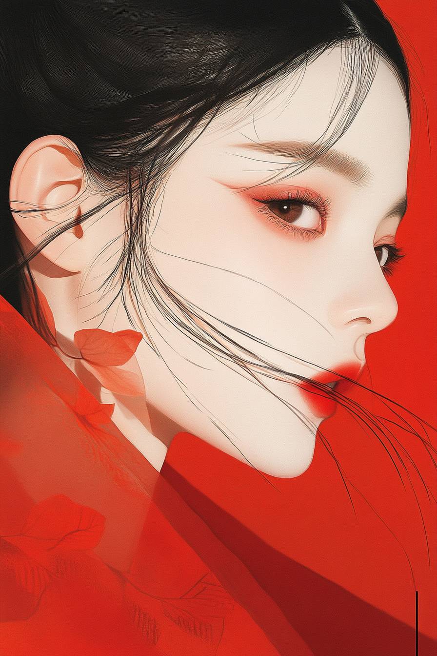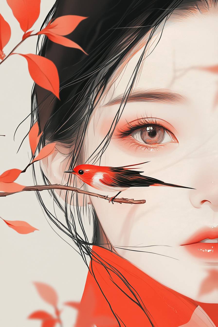 主なテーマは漢服女性、ミニマリズム、ナショナルトレンド、幾何学的形状、新しい中国スタイルの漫画、はっきりしたまつげ、完全で明るい黒目、清潔で透明な目、はっきりとした大きな目、目のハイライト、ポスター、雑誌の表紙、パンフレット、ポスターアート、ムーブメントミニマリズムスタイル、ぼやけた形、女性の美しさ、淡い赤と淡い黒、生命のような鳥のイラスト、クローズアップ、柔らかいグラデーション
