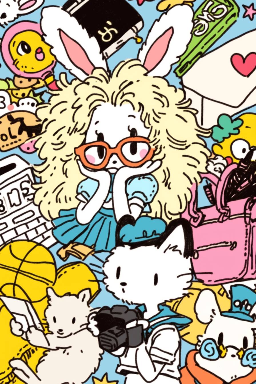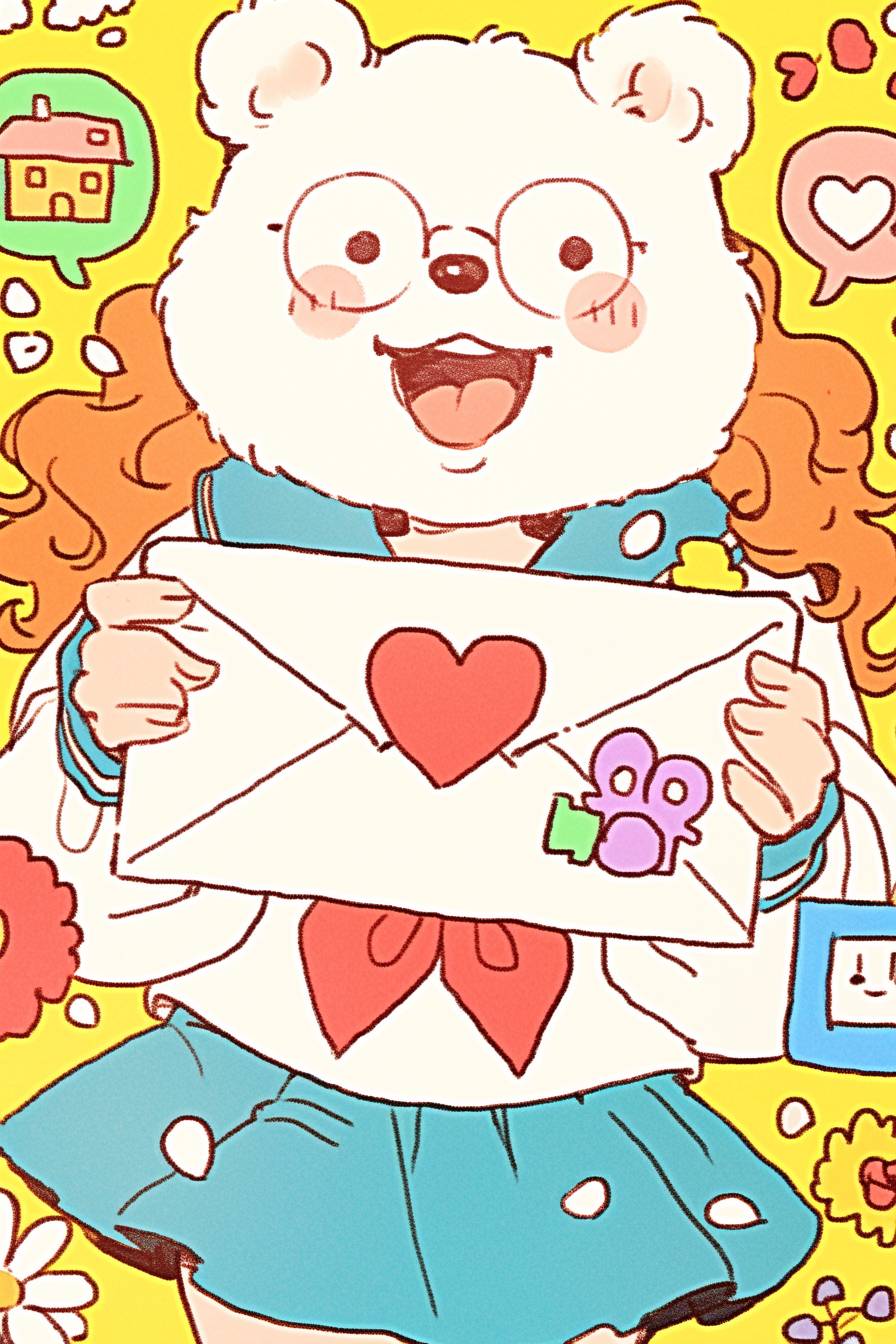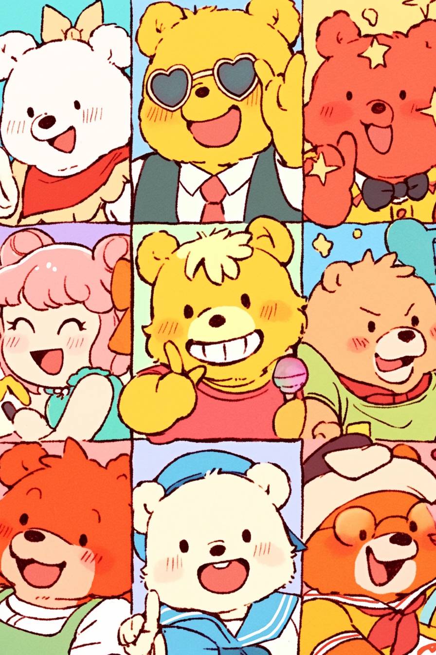 90s sticker with a colorful pastel background, vintage comic-style kawaii cute characters on each block in the grid, "85", a tennis player and a sailor girl, one square has a pink heart-shaped envelope icon, another a green flower, and a third a yellow sun outline, all surrounded by a playful border. The character designs include a cheerful bear mascot wearing glasses and holding a letter or mail symbol, a smiling woman in a sailboat outfit, a boy playing basketball, and small houses. --chaos 5 --ar 85:128 --style raw --sref 1454511430 --personalize f6uynmu --stylize 500 --niji 6