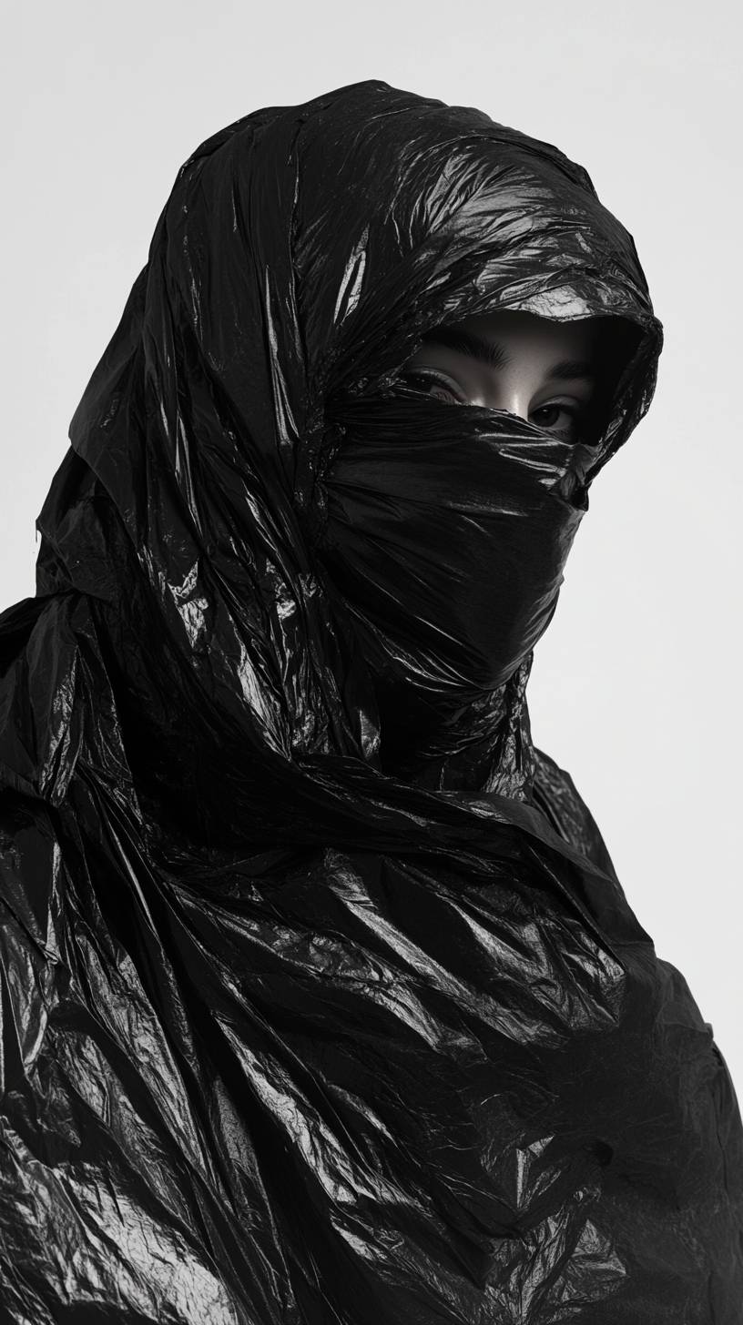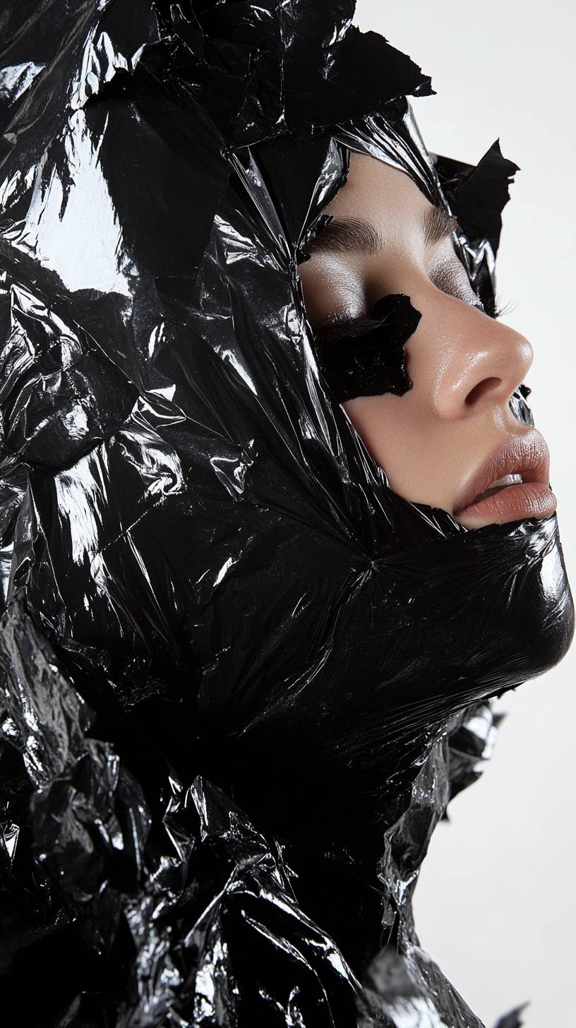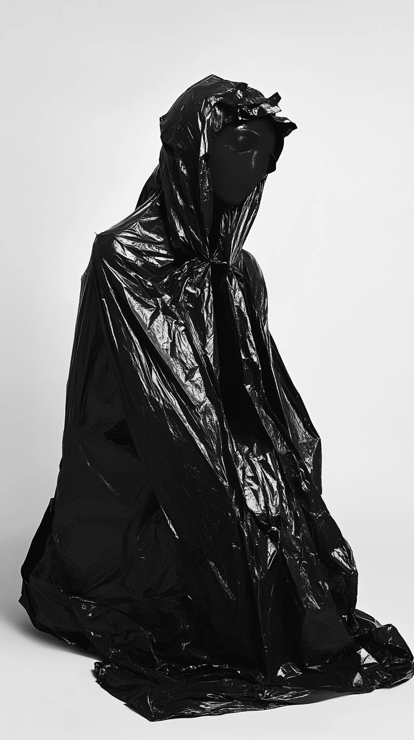 Artistic fashion portrait, minimalism, model covered in black trash bag, medium shot, in the style of Nick Knight and Jeanloup Sieff. Artistic fashion portrait, minimalism, model covered in black trash bag, medium shot --ar 9:16 --v 6.1