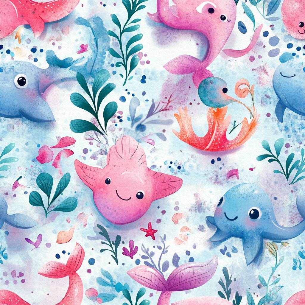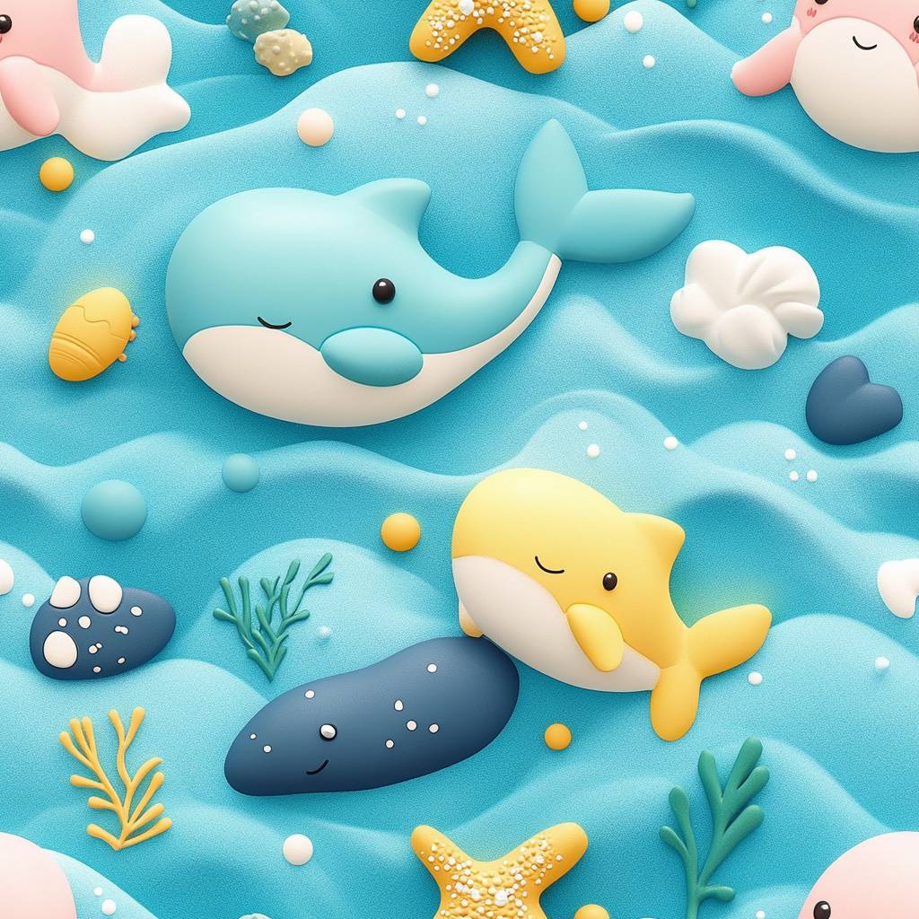 The color is very bright. Seamless 3D high-definition cartoon pattern with marine plant patterns. The spring and summer color scheme features five to six vibrant and adorable 3D cartoon marine animals, placed on a dreamy, clean, and soft random light color watercolor background to create a strong 3D feel. They are placed in different directions with cute 3D decorations next to them.high resolution,1080P,8K,good aerial control,high detail --chaos 15 --ar 1:1 --tile --style raw --v 6.1