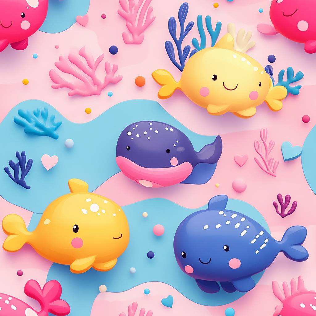 このデザインは明るい色合いと海洋植物の3Dカートゥーンパターンを特徴とし、活気あふれる海洋生物と夢のような水彩背景を組み合わせています。