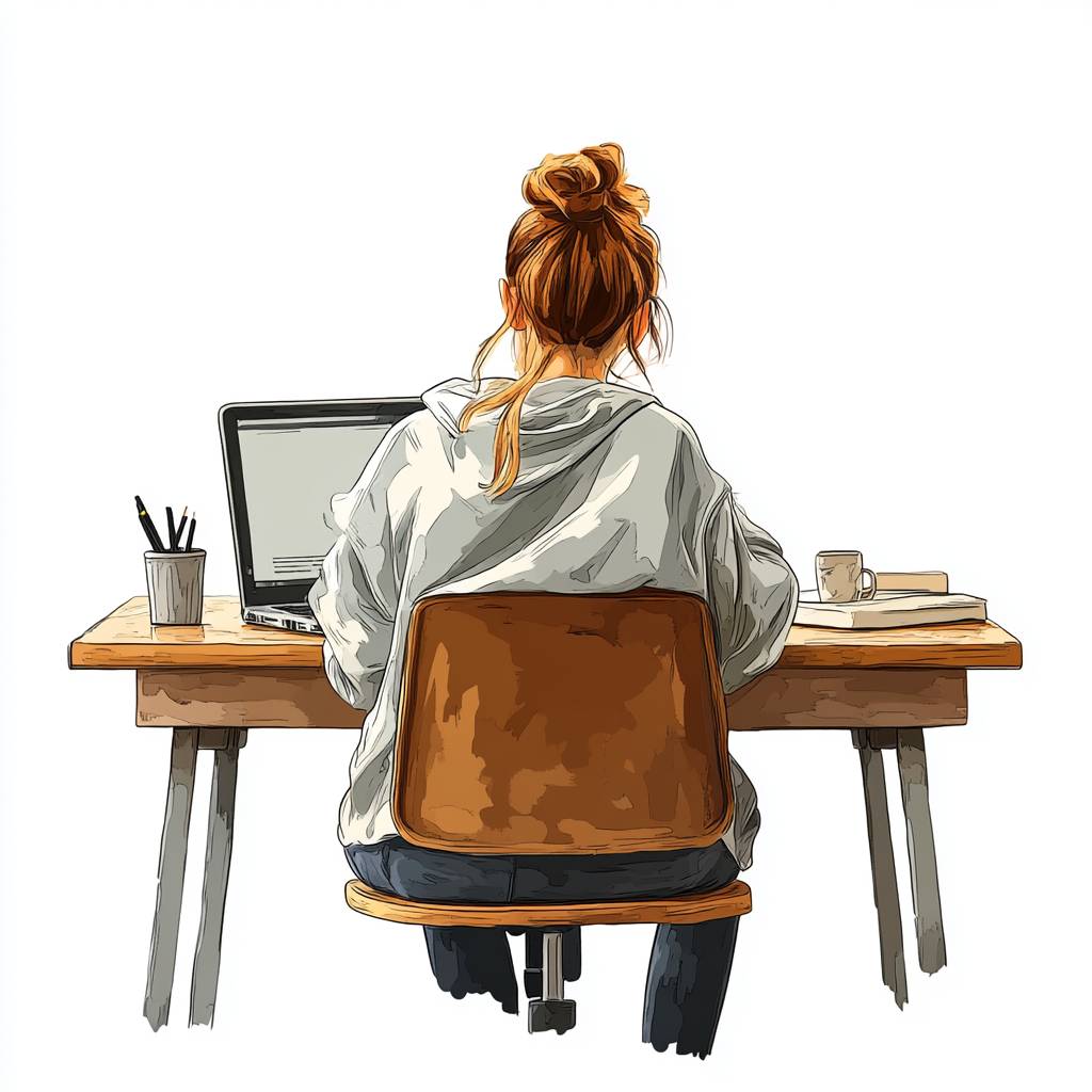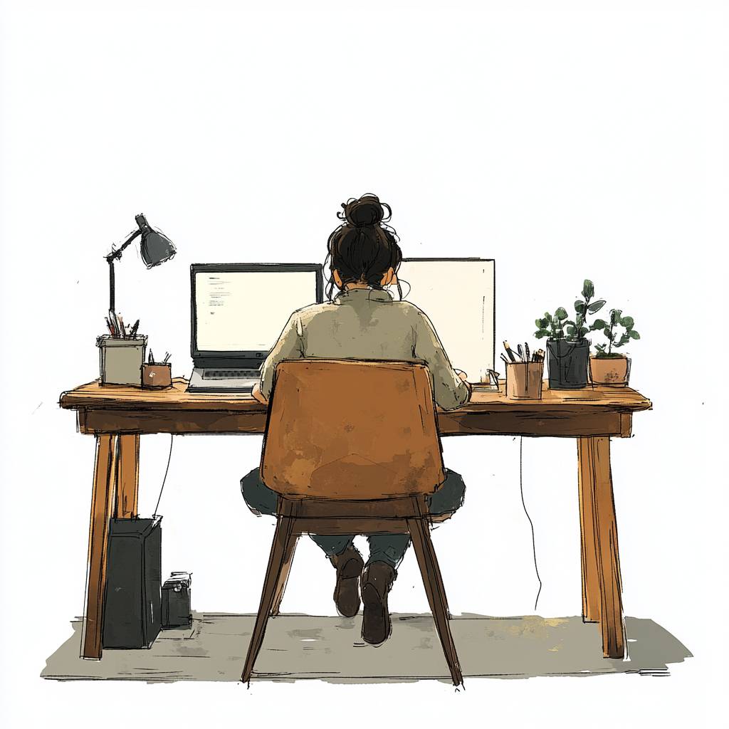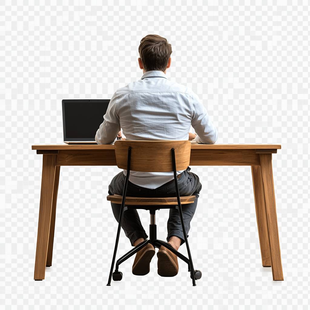 オフィスでデスクに座ってノートパソコンを使っている人のアニメーションスタイルのイラスト。