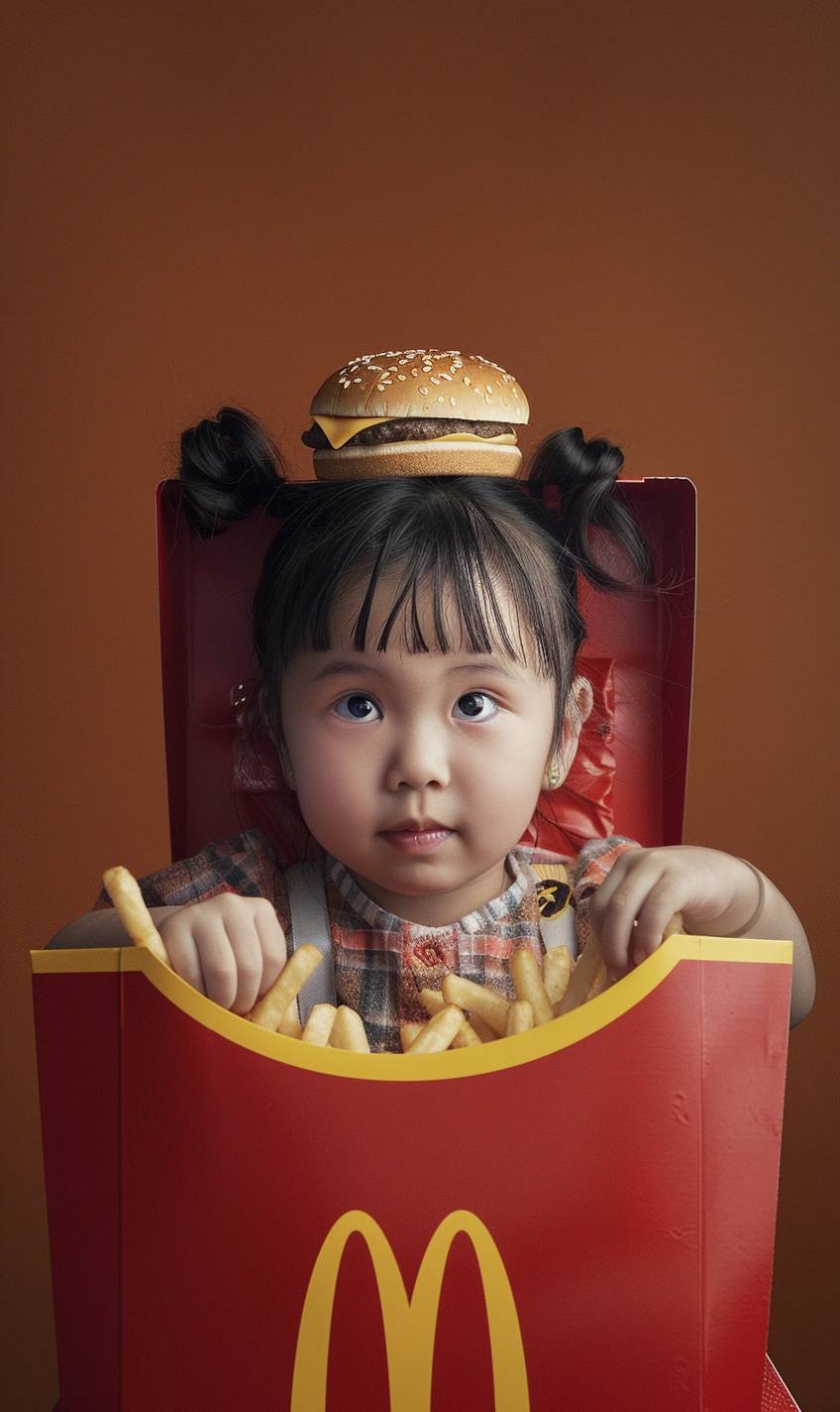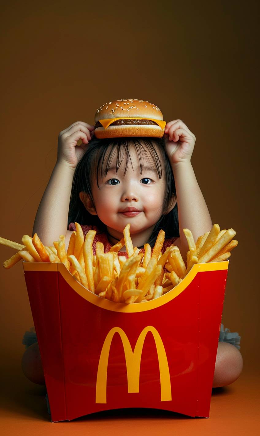 Real art photography, children's photo, a cute, wide-eyed 3-year-old girl sitting in a red box of McDonald's fries, With two burgers on each side of his head, a red lid open behind him, Chinese faces, With a cute, cute look on her face, hands clenched at her sides, With a playful character design and lively facial expressions in the style of photographic portraitures and advertising posters, the light orange and dark gray artwork has a kawaii art style. --ar 3:5 --v 6.0