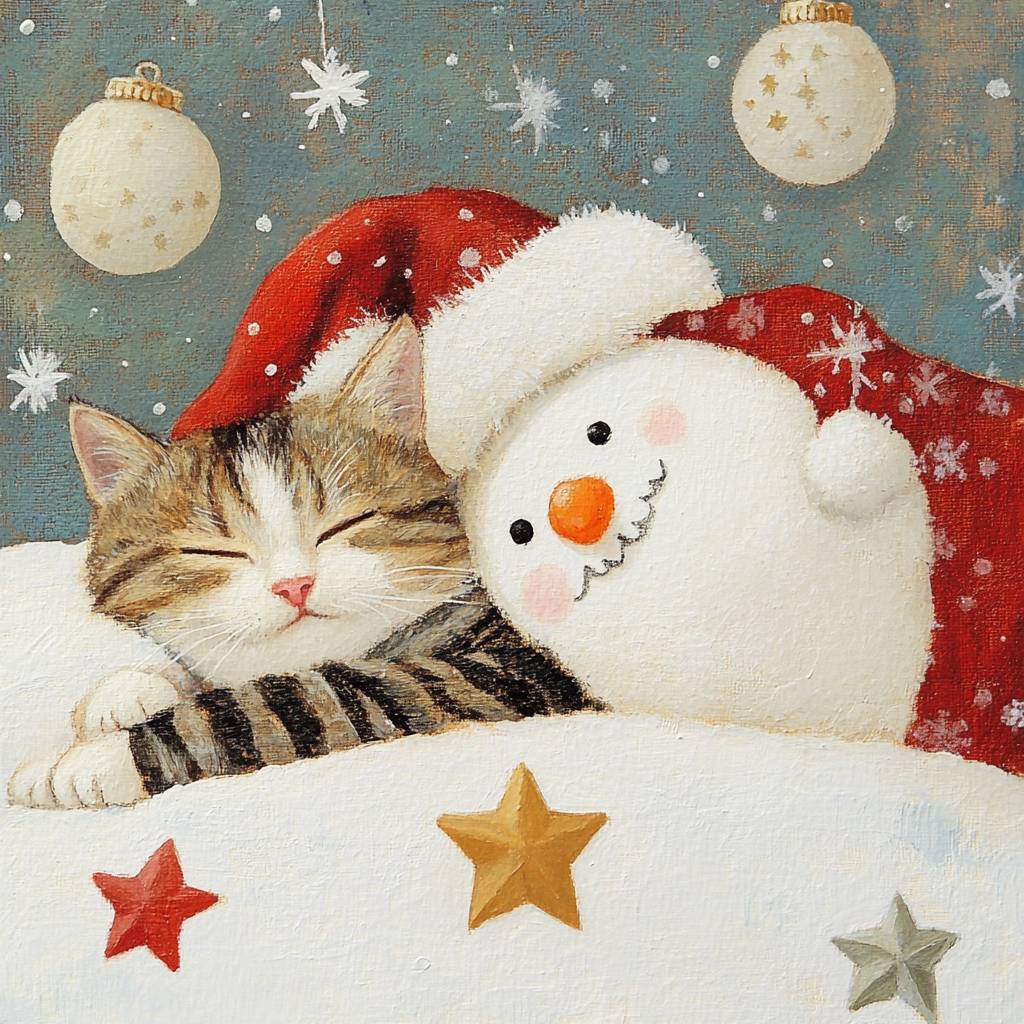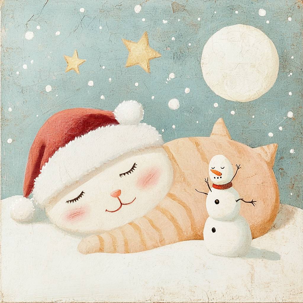 A sleeping cat, snowman, Santa Claus Costume Play, stars and moon, --profile 7f67doo --v 6.1