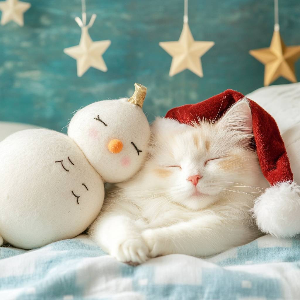 寝ている猫、雪だるま、サンタクロースのコスプレ、星と月