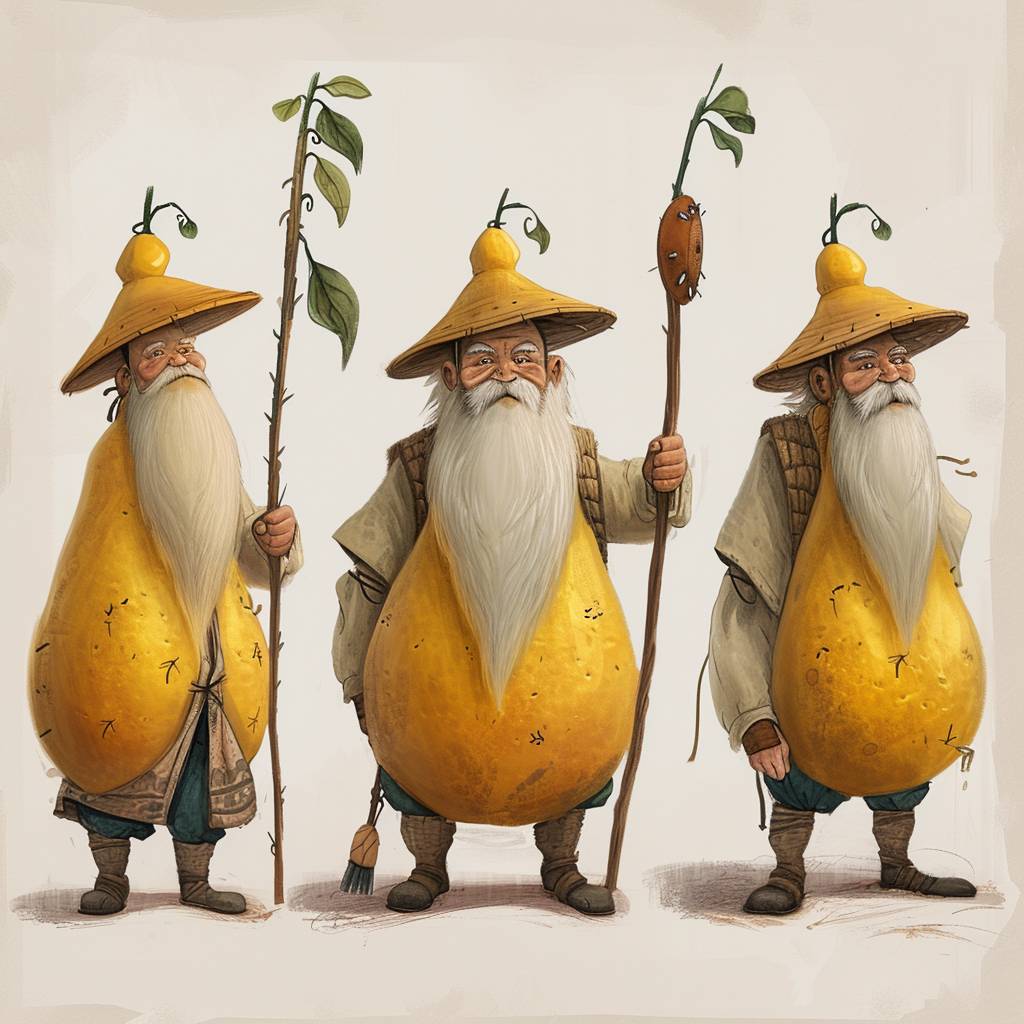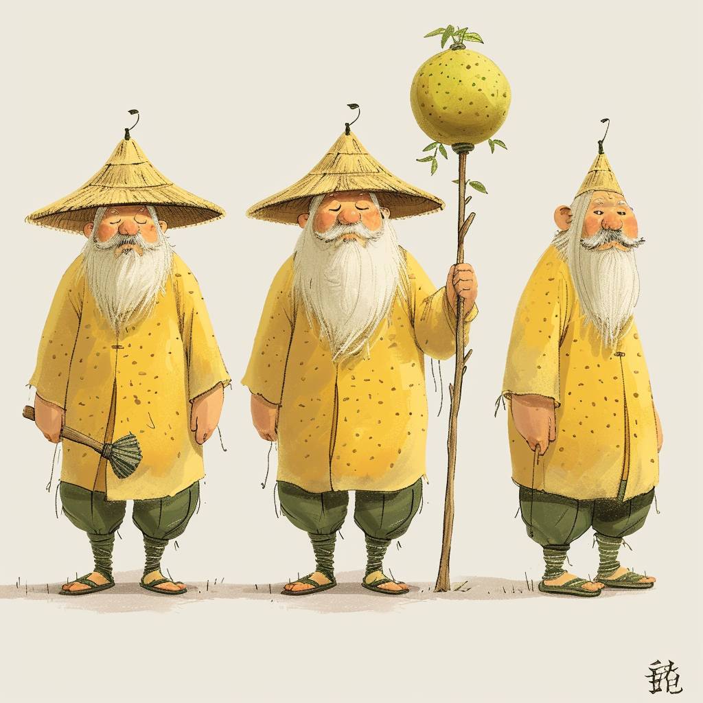 Grandpa Yuxiang's IP, a hat made of pomelo skin, a cartoon with a round pomelo body, long eyebrows and beard, carrying a hoe ready to go out into the field. Draw left, front, and back views respectively, --quality 0.5 --v 6.0