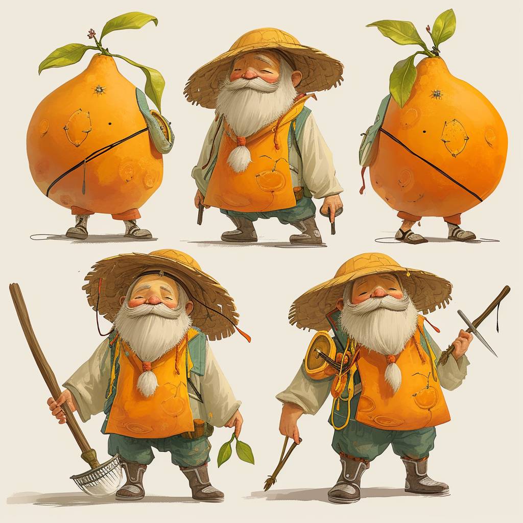 ユシャンおじいさんのキャラクター、グレープフルーツの皮で作られた帽子をかぶった、丸いグレープフルーツの体、長い眉毛とひげを持ち、田んぼに出かけるために鍬を持っています。左側、正面、背面の視点をそれぞれ描きます。