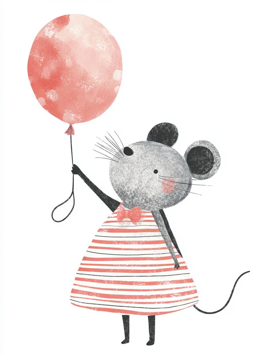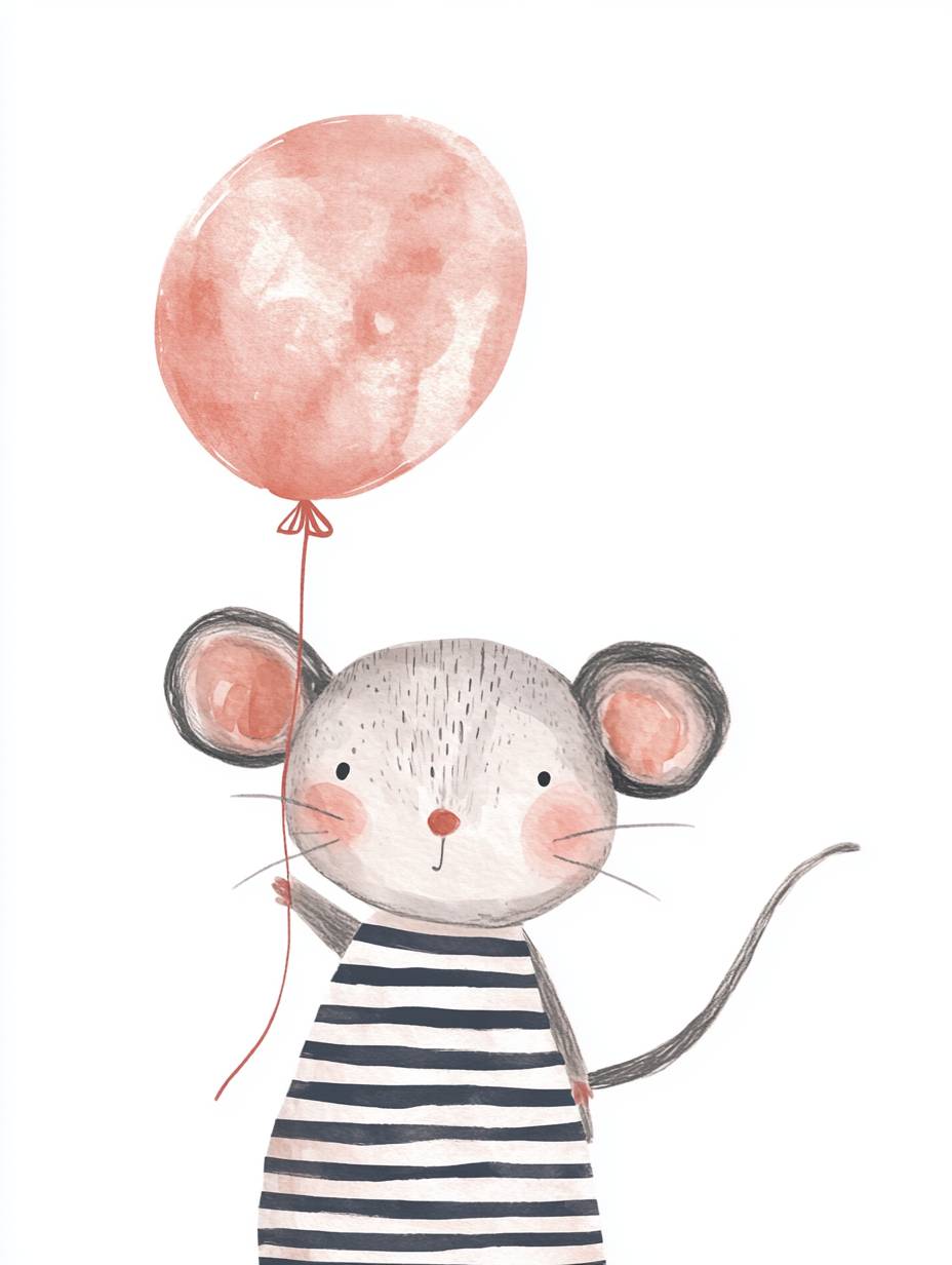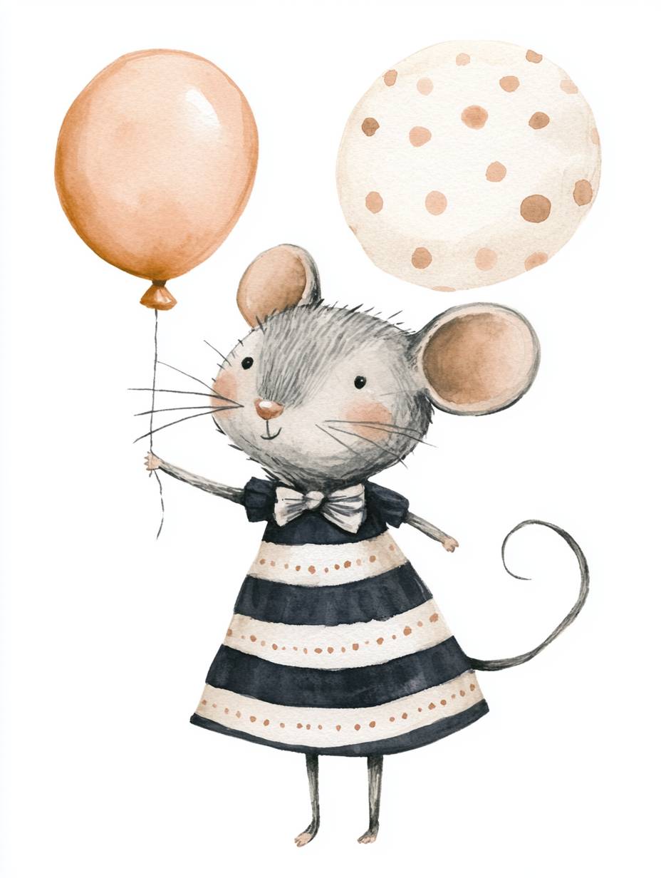 かわいいバースデーカードのイラスト、ストライプのドレスを着た動物のネズミがバルーンを持っている、シンプルな描画スタイル、グレーのネズミ、白い背景、水彩画、パステルカラー、子供の本のイラスト、かわいいカートゥーン風のデザイン、シンプルなライン、ミニマリスティック、白い背景、シンプルなディテール、キャラクターの顔に詳細なし、シンプルな描画スタイル。