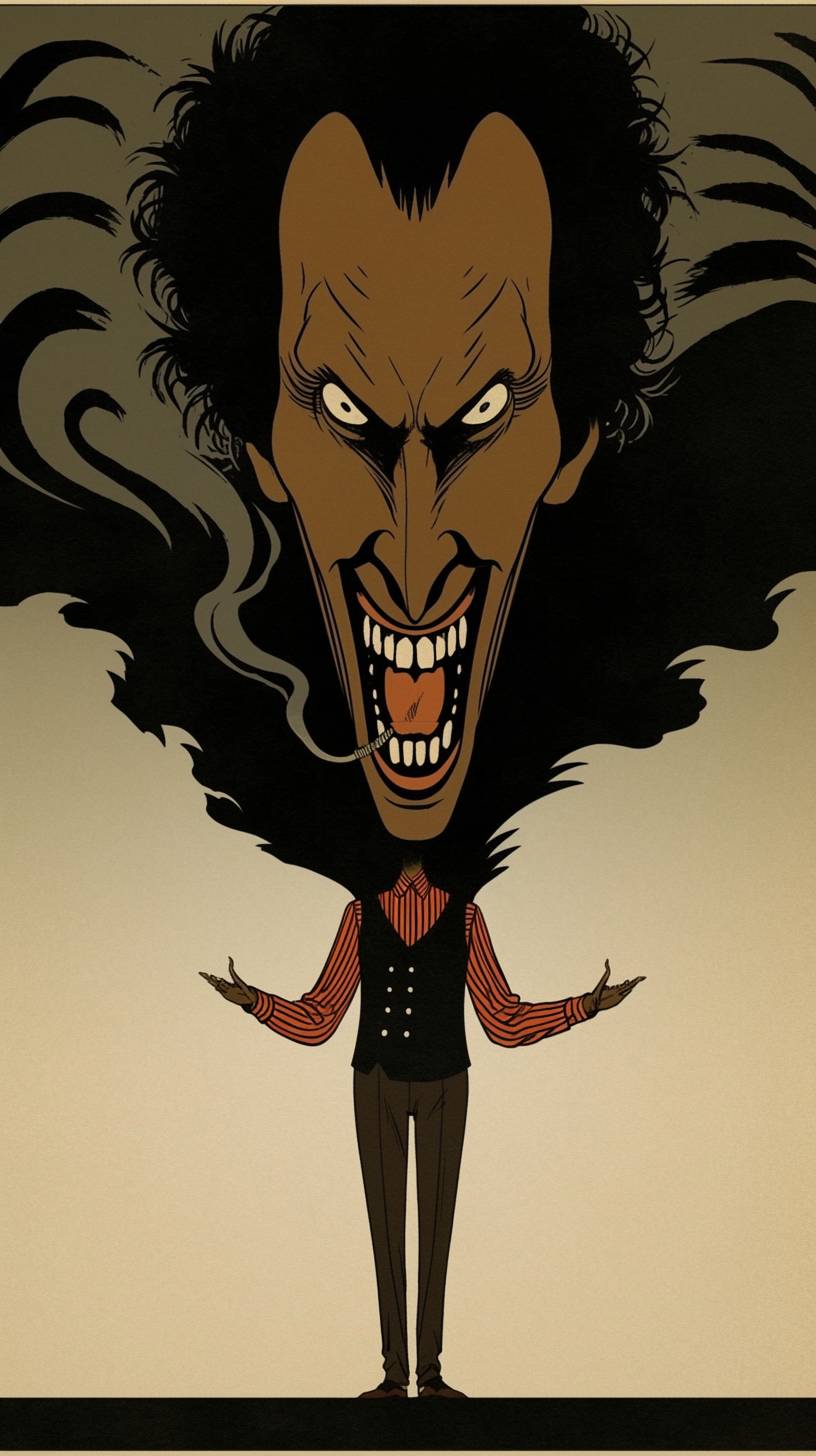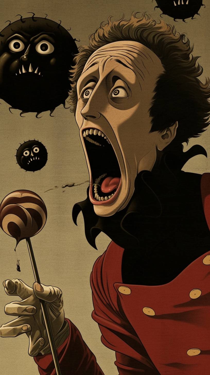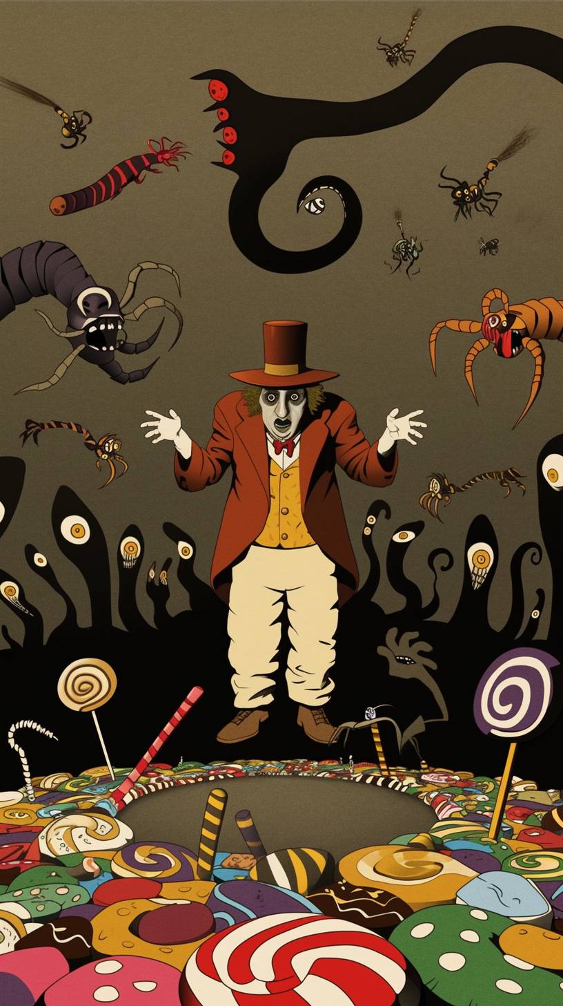 ケニー・シャーフのスタイルで描かれたウィリー・ウォンカのグロテスクな風刺画。