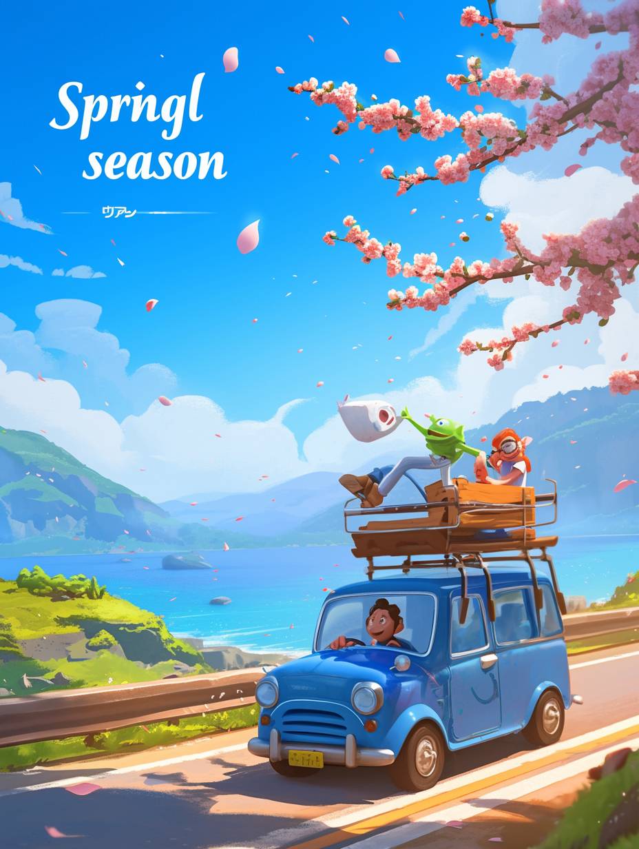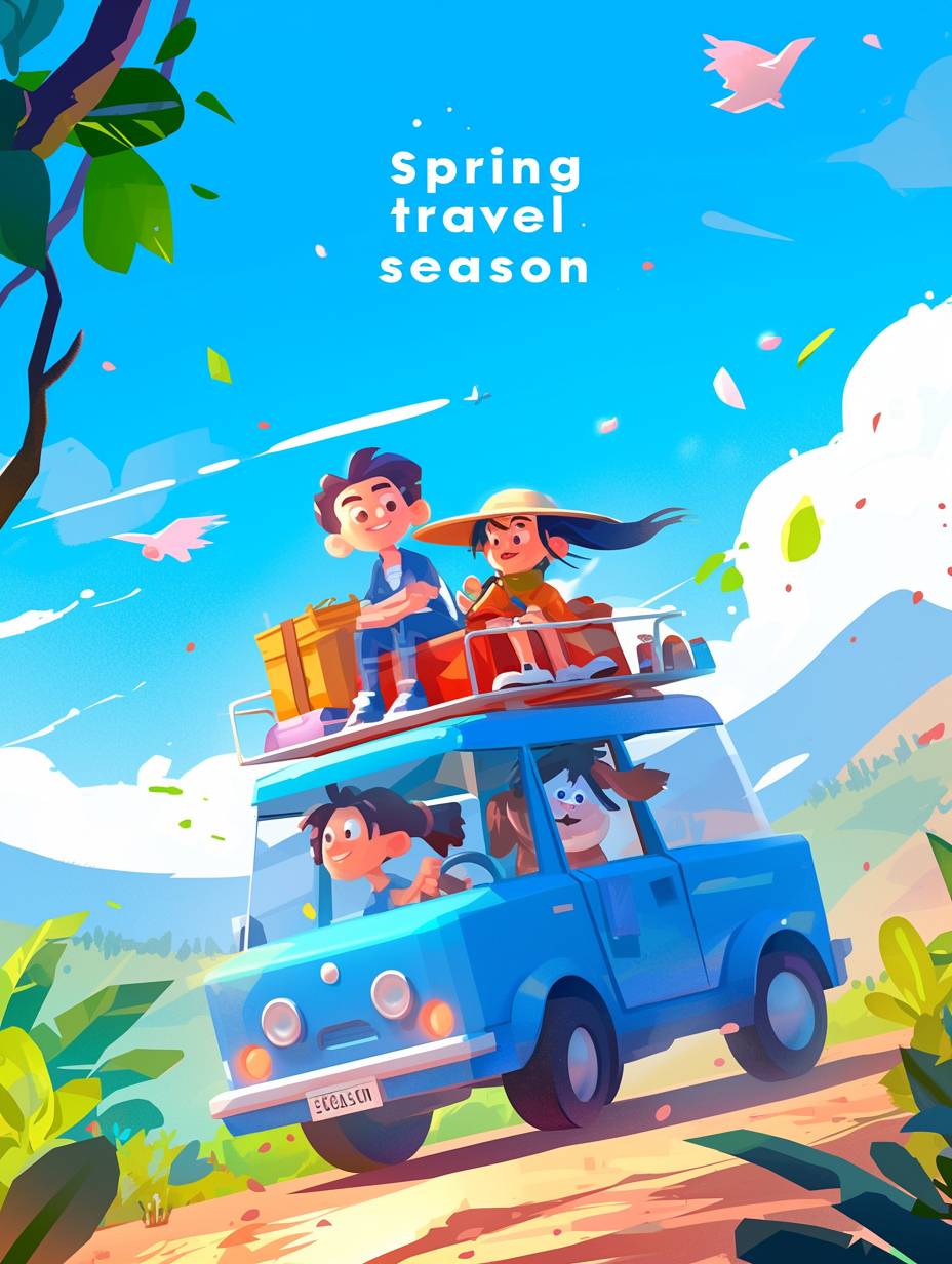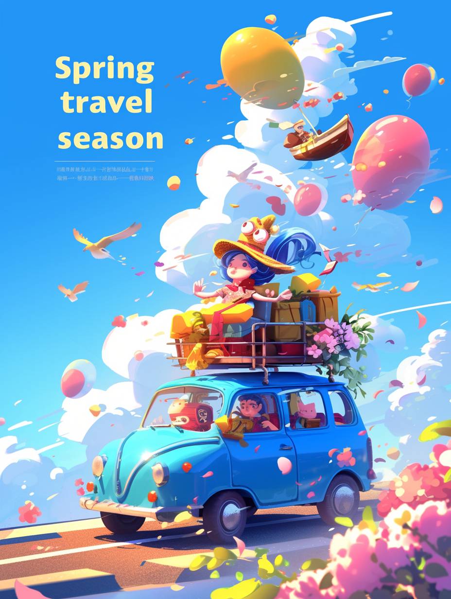 The cover of the Traveling season poster features, with an blue small car carrying. The title "Spring travel season", blue sky background,3D rendering in the style of Pixar, bright colors, high saturation, full body portrait, exaggerated movements, lively atmosphere in the style of Pixar --niji 6 --ar 3:4