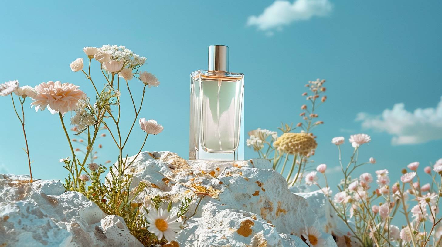 製品写真、マイクロクローズアップ、シャネルの香水、透明、巨大な白い岩の上に座り、横に花があり、青い空、自然と人工要素の融合、白とベージュが特徴、スタジオライト、高詳細、最高品質、HD、8K。