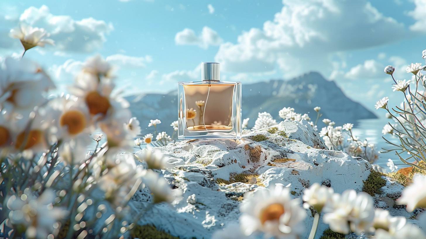 product photography, micro close-up, Chanel perfume, translusant, sitting on giant white rock, with flowers at the side, blue sky, combining natural and man-made elements, featuring white and beige, studio light, high details, best quality, HD, 8K, --ar 16:9 --s 250 --v 6.0