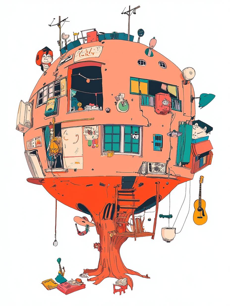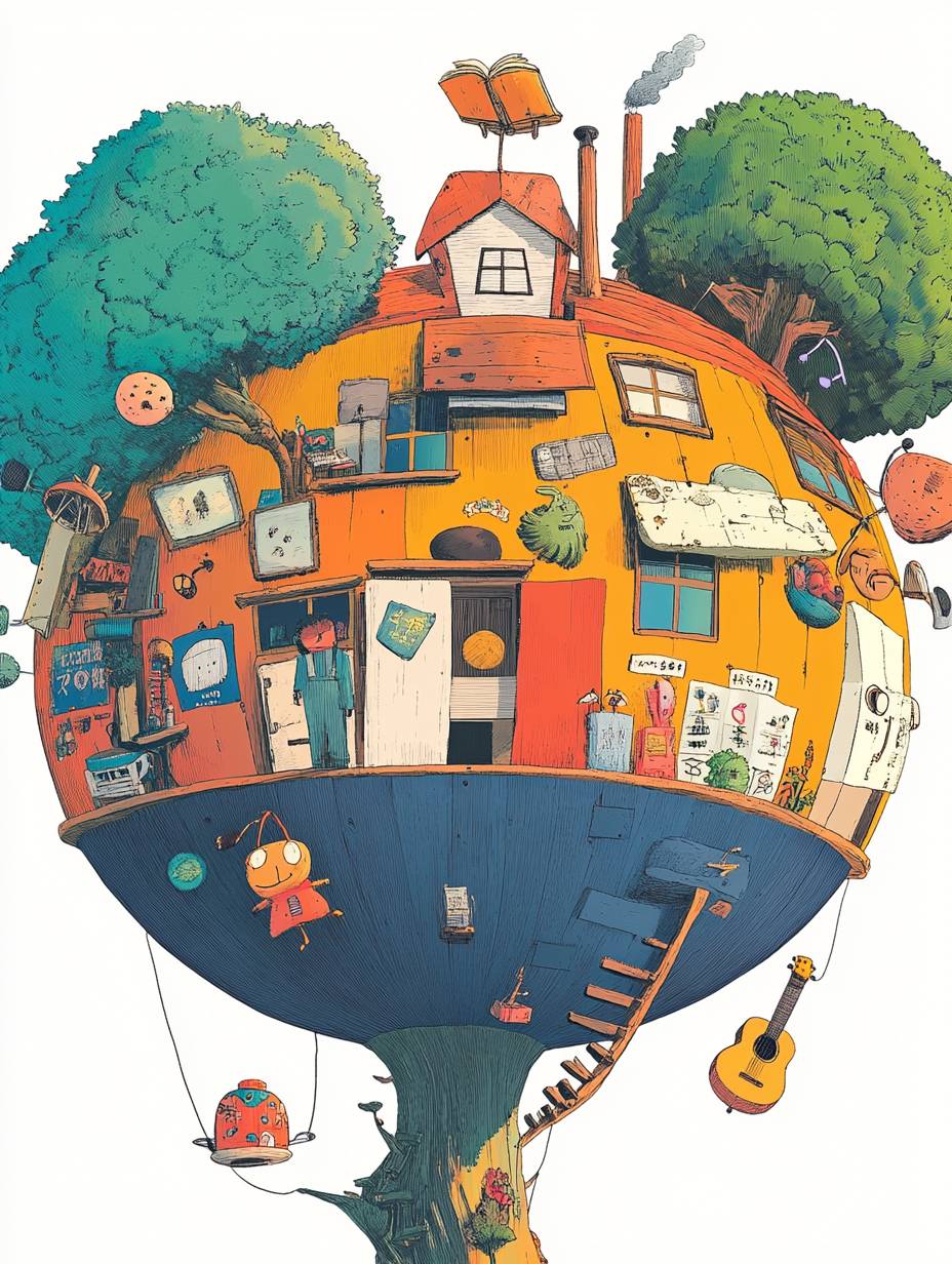 アニメスタイルの球体の中にあるかわいいツリーハウスのイラストで、複数の角度や異なる視点が特徴です。デザインには楽器、おもちゃ、本、カラフルな日本語の文字、鮮やかな詳細、フラットな色、シンプルな形状など、さまざまなオブジェクトが含まれています。影のない白い背景に呈示されており、モービウススタイルです。