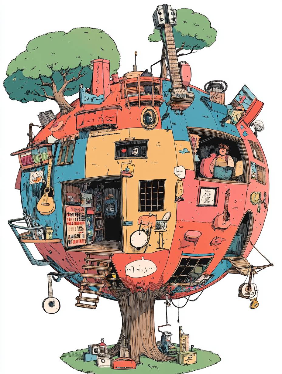 A cute illustration of a tree house inside an anime-style sphere, featuring multiple angles and different perspectives. The design includes various objects such as musical instruments, toys, books, colorful Japanese lettering, vibrant details, flat colors, and simple shapes. It is presented on a white background with no shadows, in the style of Moebius. --ar 3:4 --style raw --profile bwov8qe --stylize 50 --v 6.1