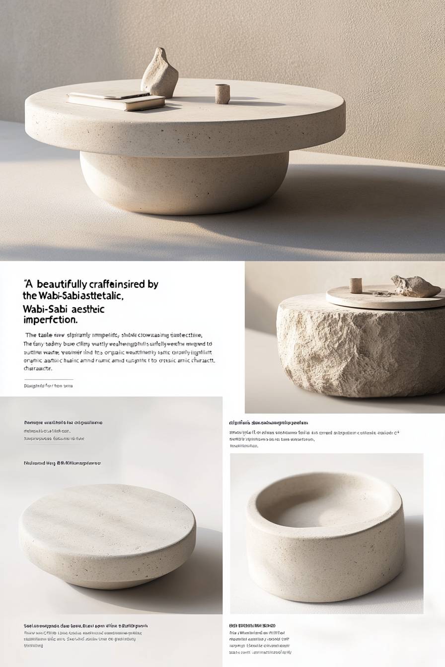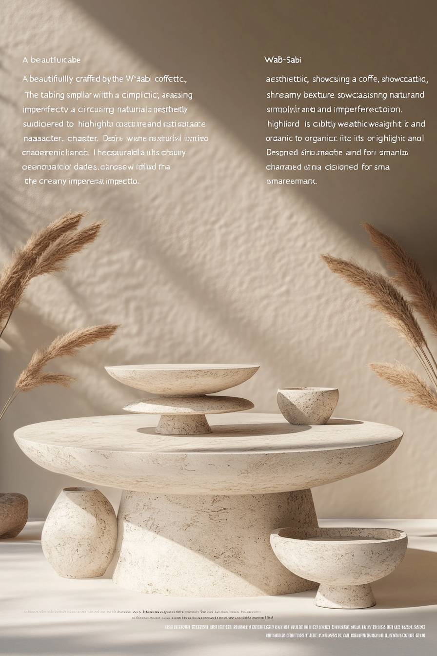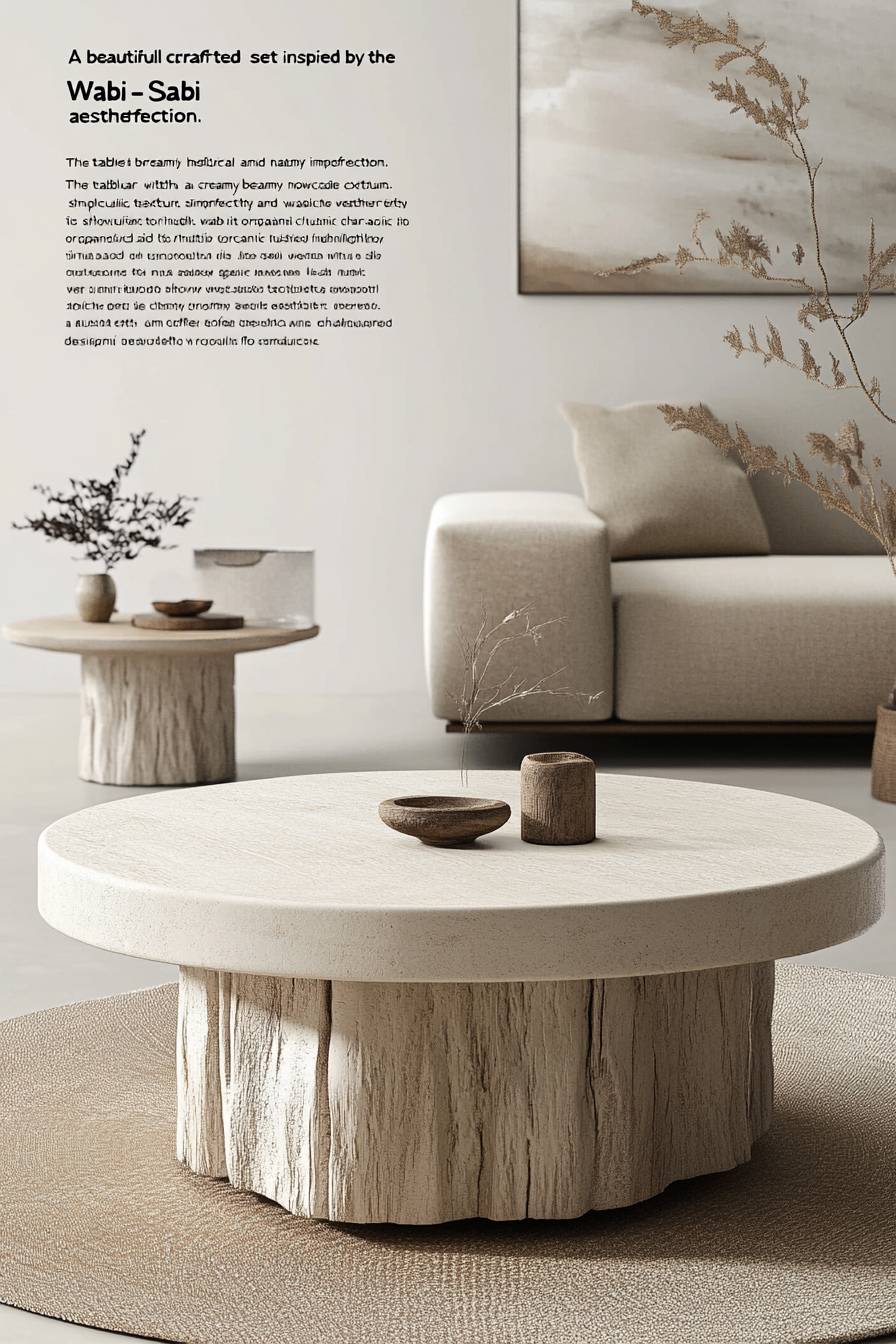 "A beautifully crafted coffee table set inspired by the Wabi-Sabi aesthetic, showcasing simplicity and natural imperfection. The table is circular with a creamy beige texture, subtly weathered to highlight its organic and rustic character. Designed for small apartments and luxury living rooms, the set features a minimalist yet elegant design with a smooth matte finish. It includes delicate detailing that emphasizes the natural grains and texture of the material. Perfectly proportioned to serve as a bedside or living room accent, the table exudes a tranquil, timeless charm, harmonizing with understated luxury. Photorealistic with 8K resolution, emphasizing fine textures and soft lighting." --ar 2:3 --v 6.1