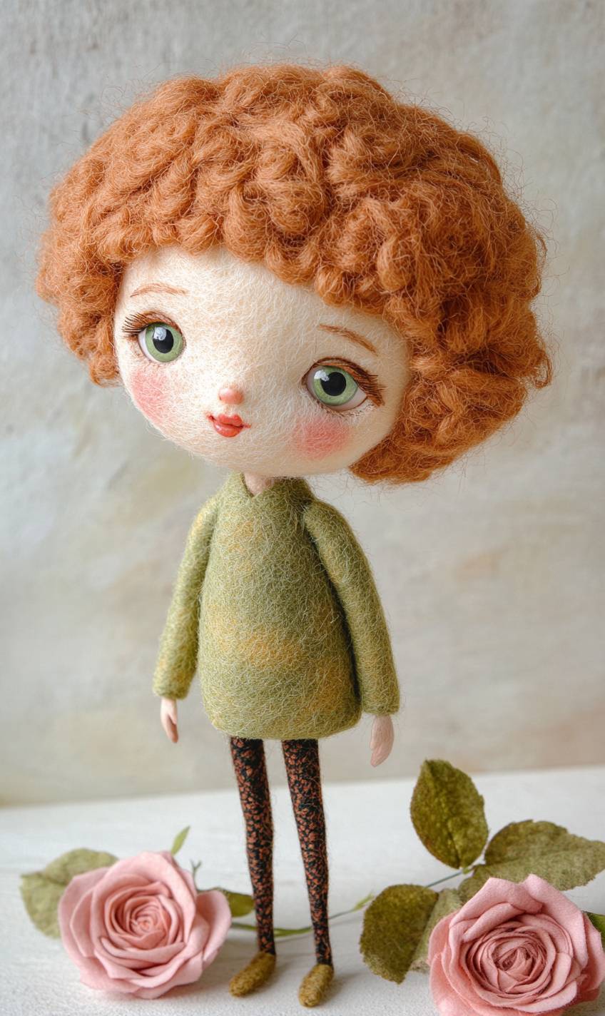 ウールフェルト人形、少し横を向いていて、とても可愛らしく、愚かな魅力を持ち、生き生きとした目を備えたブラインドボックススタイルで、特徴的な大きな頭を持っている。顔、髪、肌はファイバー生地で強調され、繊維の立体的な質感が際立っている。これにより、ウールフェルトの質感がさらに引き立ち、穀物や独自の触感、生き生きとした繊維の特性、少し粗い芸術的な魅力が明確に示されている。ブラインドボックススタイルでは、強いウールフェルトの品質を持つ魅力的な人形が示され、Q版デザインで、大きな頭がウールフェルトの独特な魅力を放っている。これは有機繊維から作られた王子で、花の要素で飾られている。前景に位置しており、顕著な被写界深度効果があり、ピンクのバラが完璧なタッチを加え、観る人を魅了する超高精細な画像を作り出している。