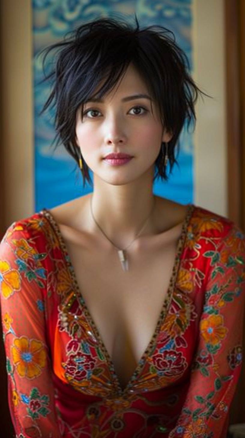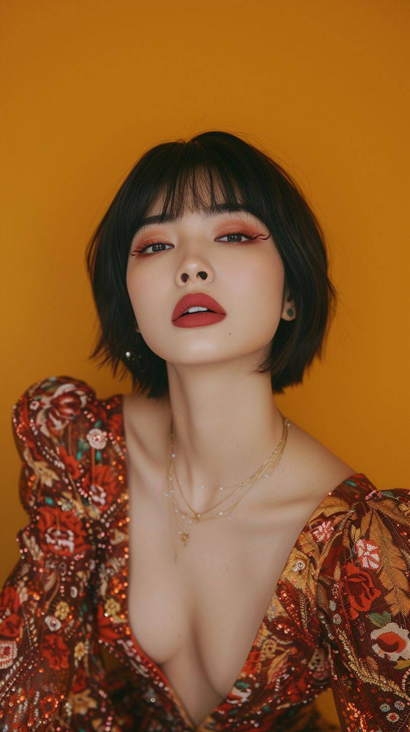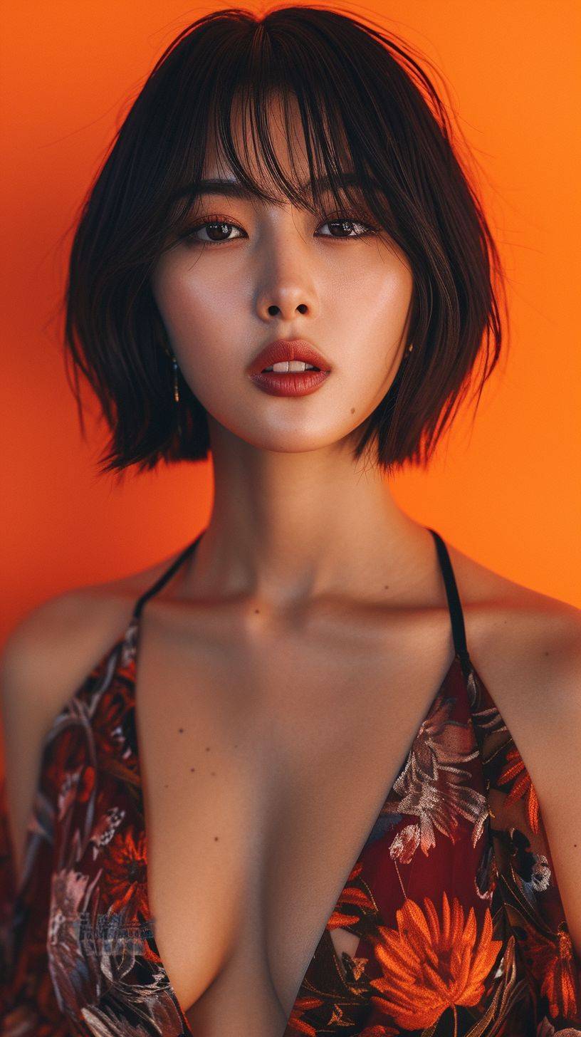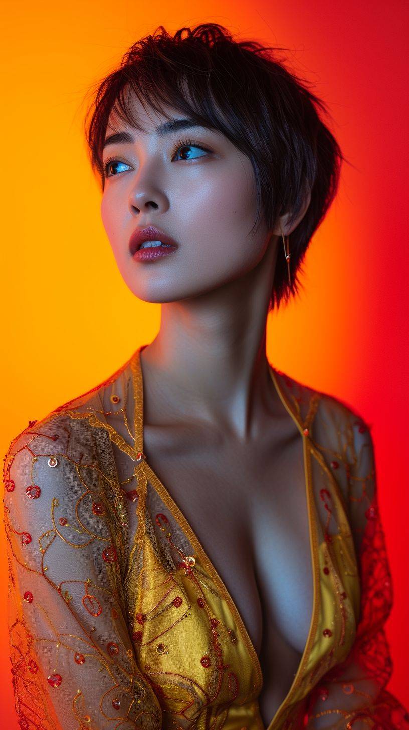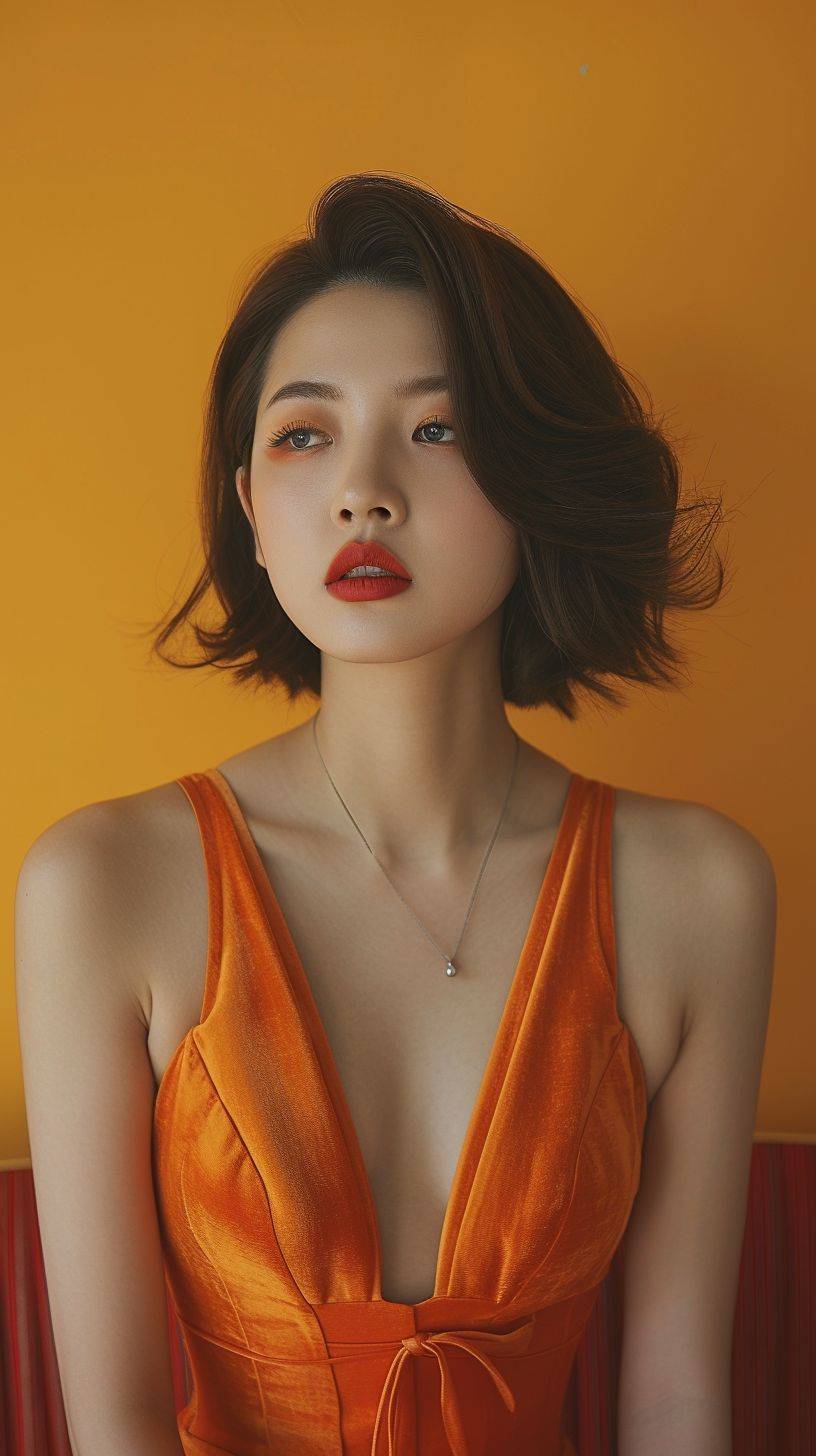magazine cover,, studio photograph of a gorgeous china model, short straight hair, in a fancy low cut dress,The camera angle is low and dramatic,The colors are orange, red, yellow, --style raw --chaos 7 --ar 9:16 --v 6 --stylize 250