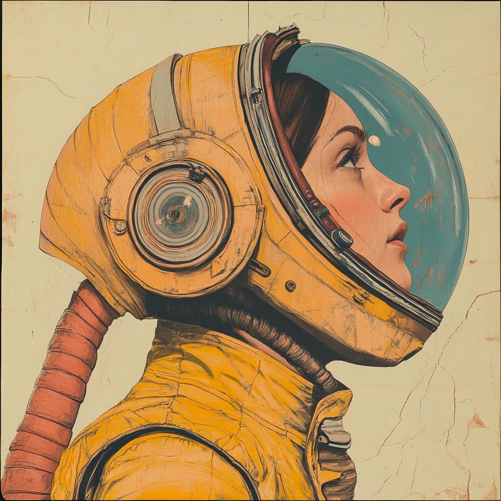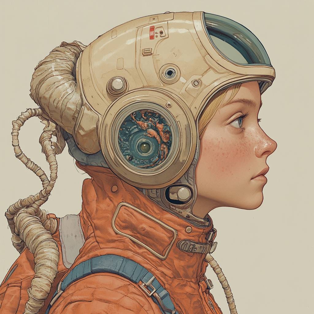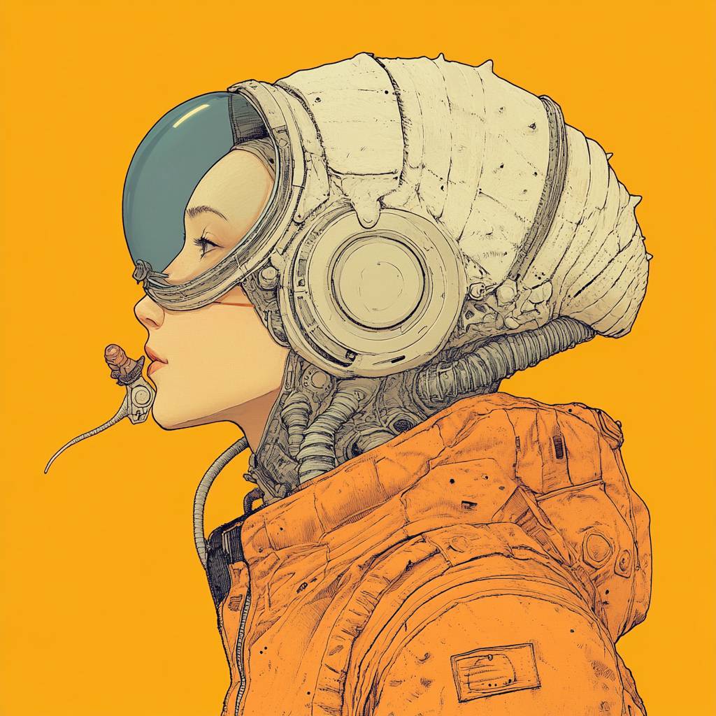 a woman has a gastropod protective suit against Submechanophobia, by Aaron Draplin --stylize 250 --v 6.1