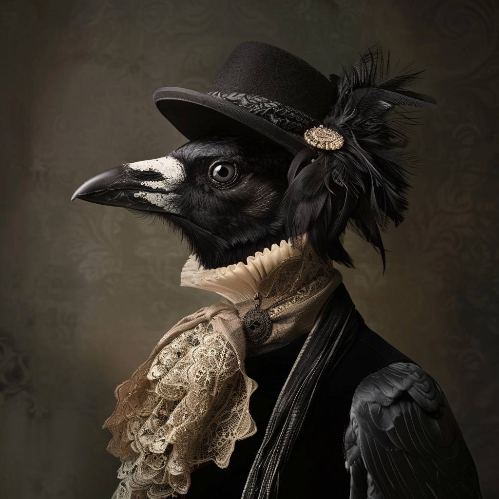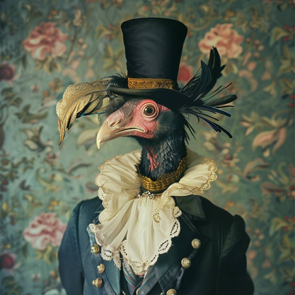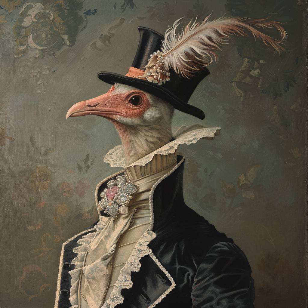 豪華な19世紀の衣装を着た擬人化された鳥。