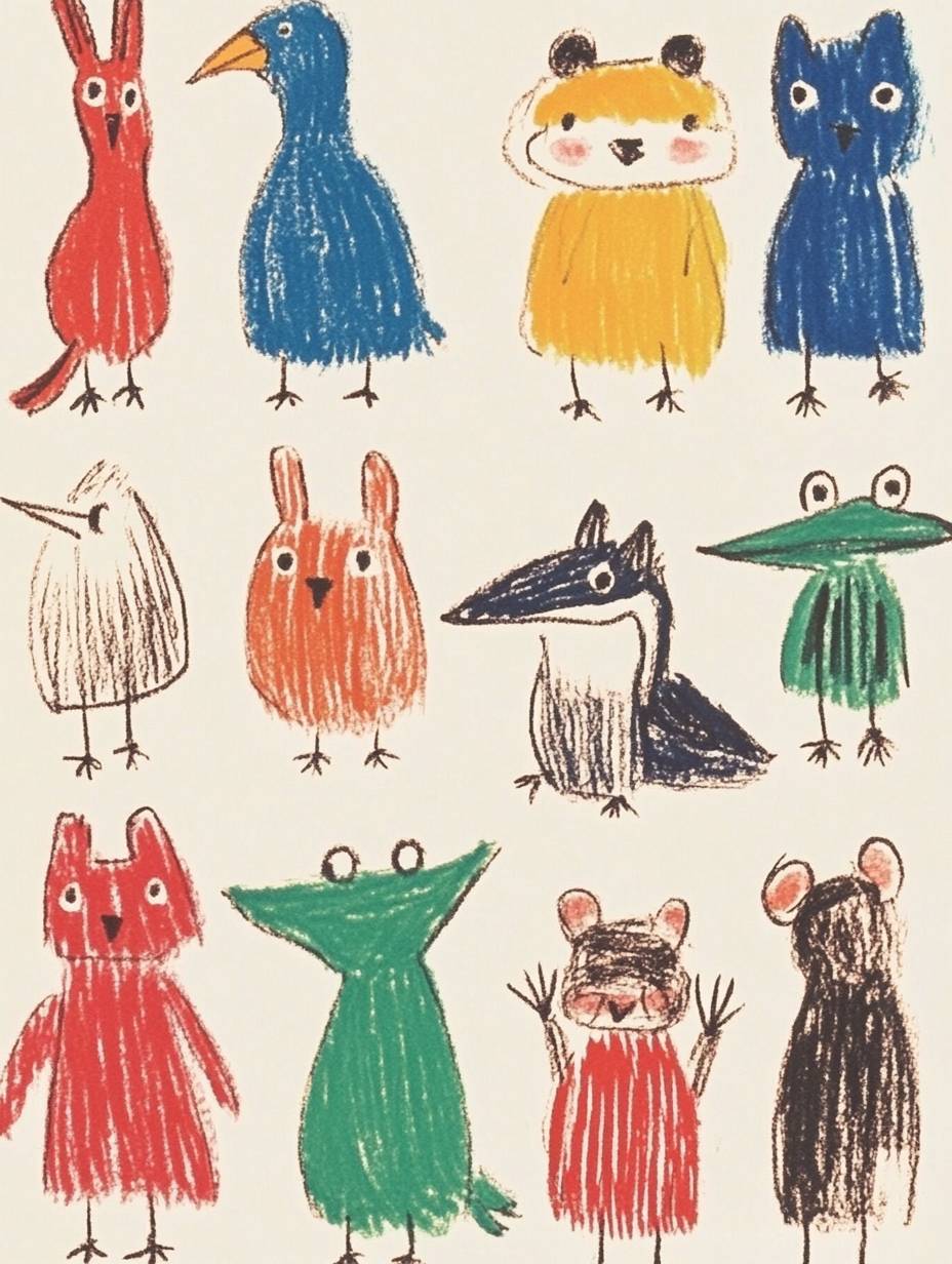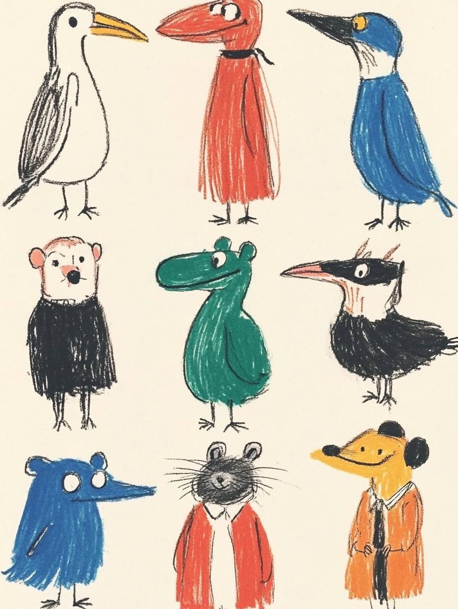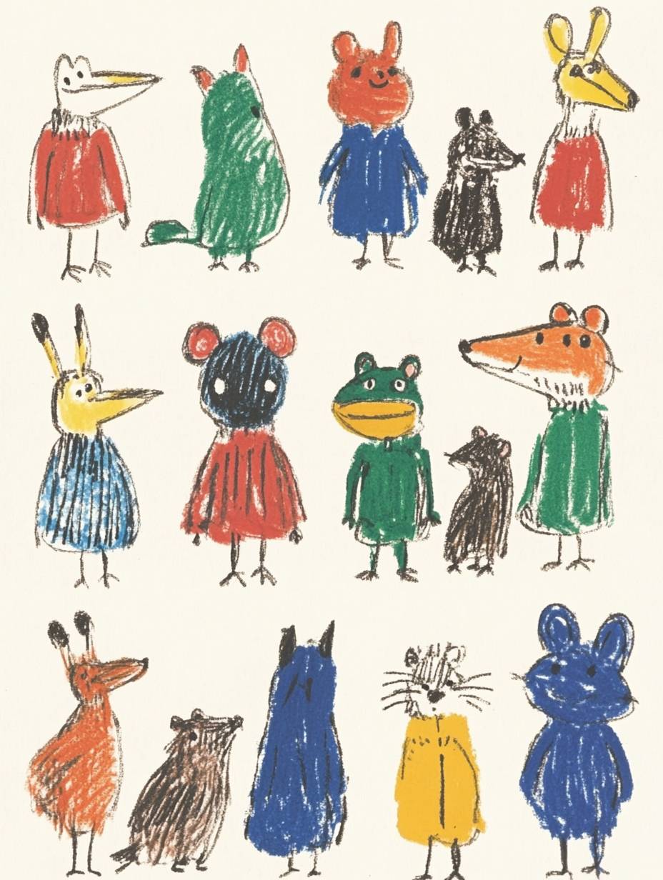 30匹可愛い微笑む動物が並んでおり、カエル、サギ、ネズミ、バジャー、モグラが含まれています。