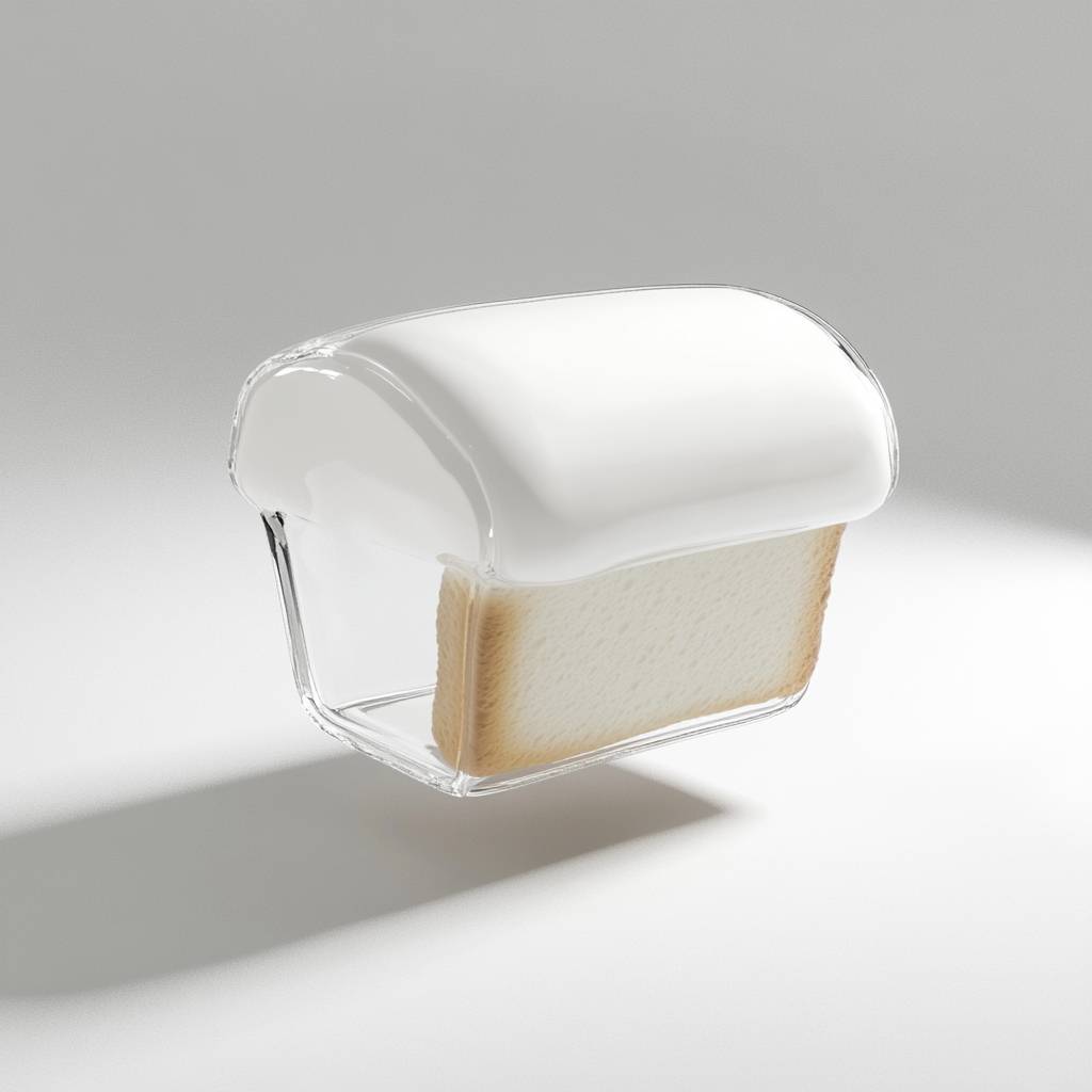 浮遊するパンの形をした賞品、モノクロの白色、透明なガラス素材。