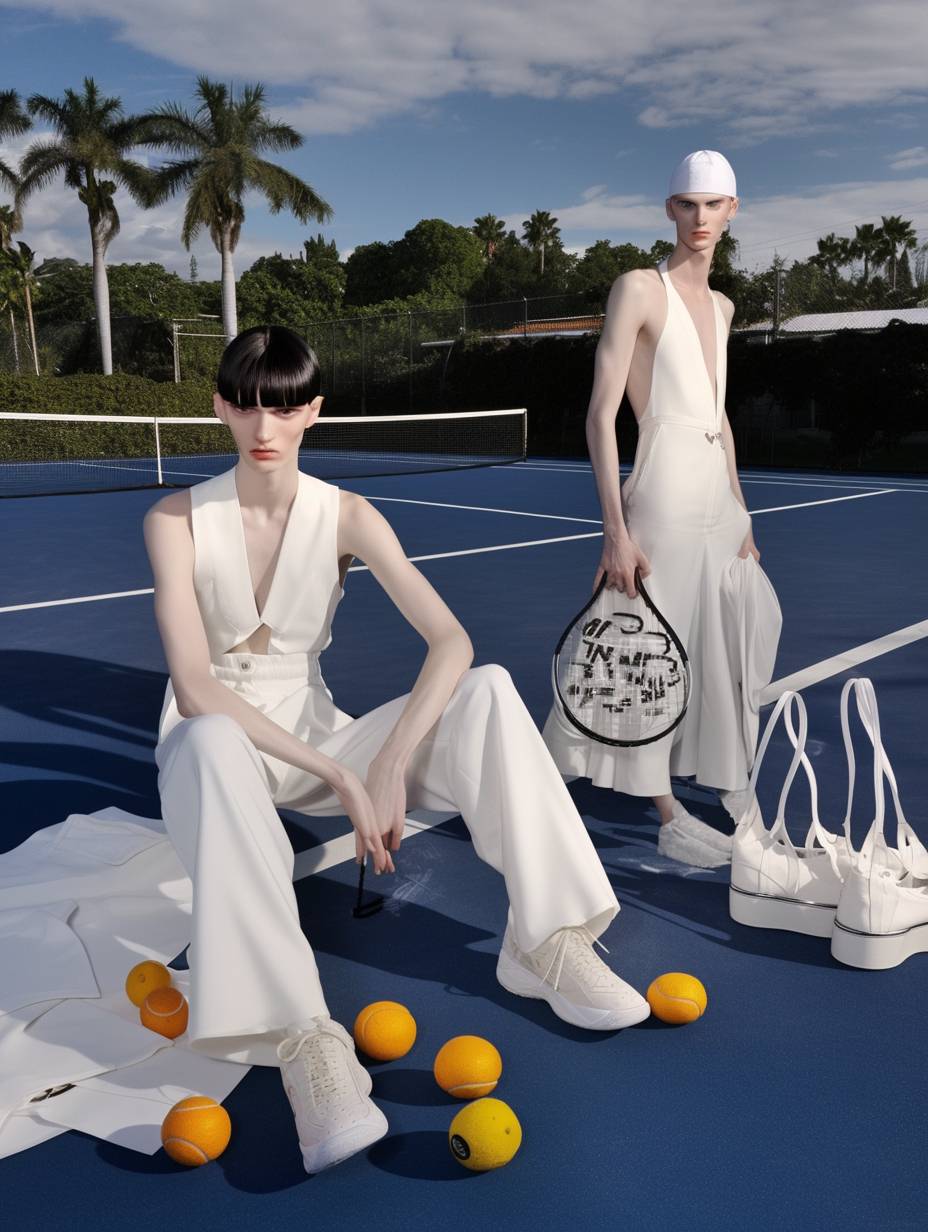 テニスコートでのファッションフォトシュート、カメラを向いて座っている数人のモデルたち。彼らはスタイリッシュな真っ白のテニスウェアを身にまとい、ミニマリストでハイファッションの雰囲気を醸し出しています。コートにはいくつかのテニスボールと鮮やかなオレンジの実が散らばっており、遊び心がありながらも洗練されたタッチを加えています。コートのクリーンで幾何学的なラインは彼らの服装のシンプルさを引き立て、柔らかく自然な光がその瞬間のエレガンスを増しています。構図は洗練されながらもリラックスしたエネルギーを捉え、スポーツとラグジュアリーをシックでモダンな方法で融合させています。