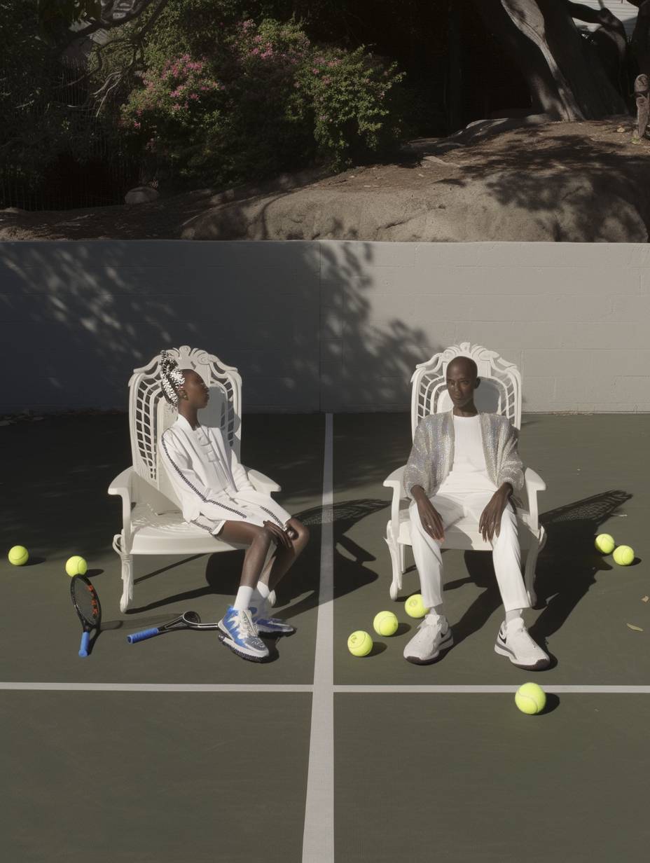 A fashion photoshoot on a tennis court featuring a couple of models, seated and facing the camera. They are dressed in stylish, all-white tennis outfits, exuding a minimalist, high-fashion vibe. The court is scattered with a few tennis balls and vibrant real fruit oranges, adding a playful yet sophisticated touch to the scene. The clean, geometric lines of the court complement the simplicity of their attire, while soft, natural lighting enhances the elegance of the moment. The composition captures a refined, relaxed energy, blending sport and luxury in a chic, modern way. --chaos 15 --ar 3:4 --style raw --weird 100 --niji 6
