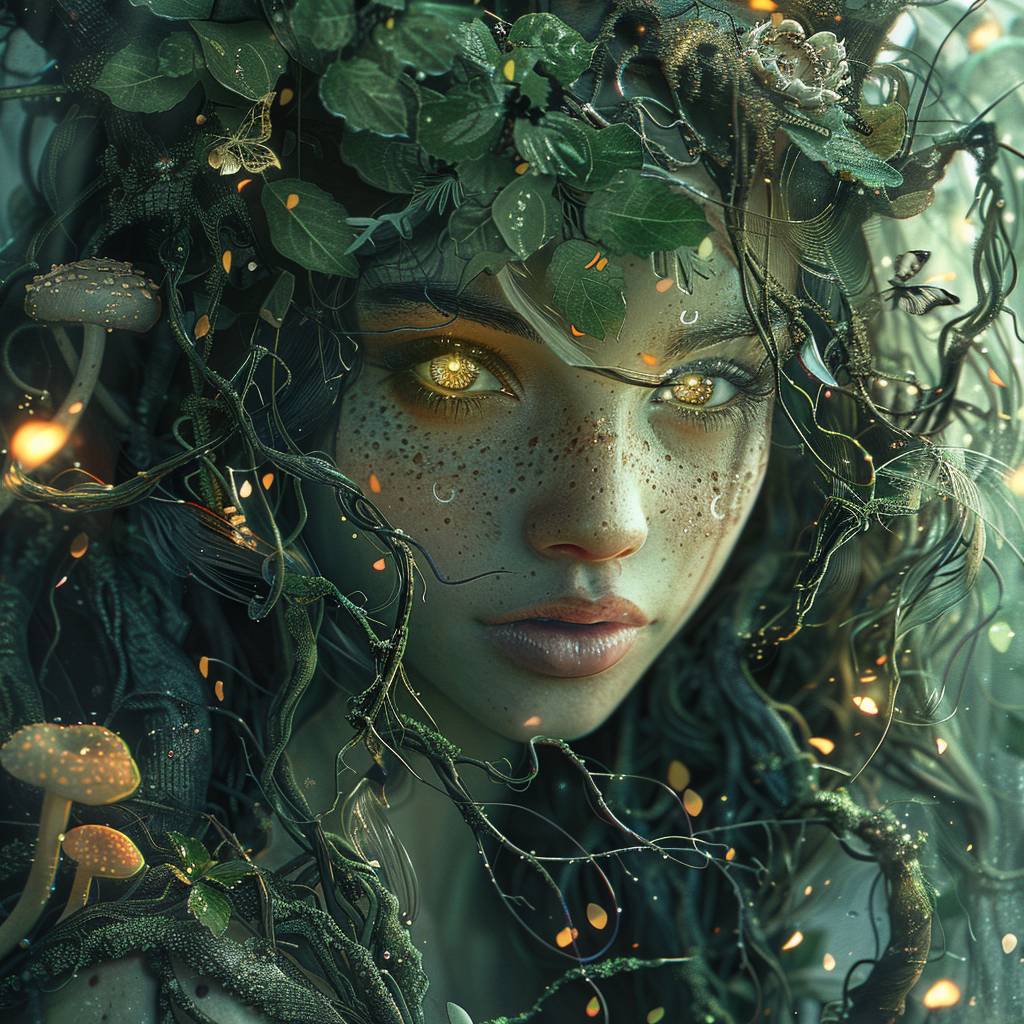 エーテリアルフォレストニンフ:森の本質を体現する女性の穏やかで魔法のようなポートレートを描いてください。彼女の肌は微妙な緑がかった色合いを持ち、髪は葉、花、つるで編まれています。彼女の目は柔らかく輝き、月の光を反射しています。背景には古代の木々、光るキノコ、萤火虫がある神秘的な森があります。