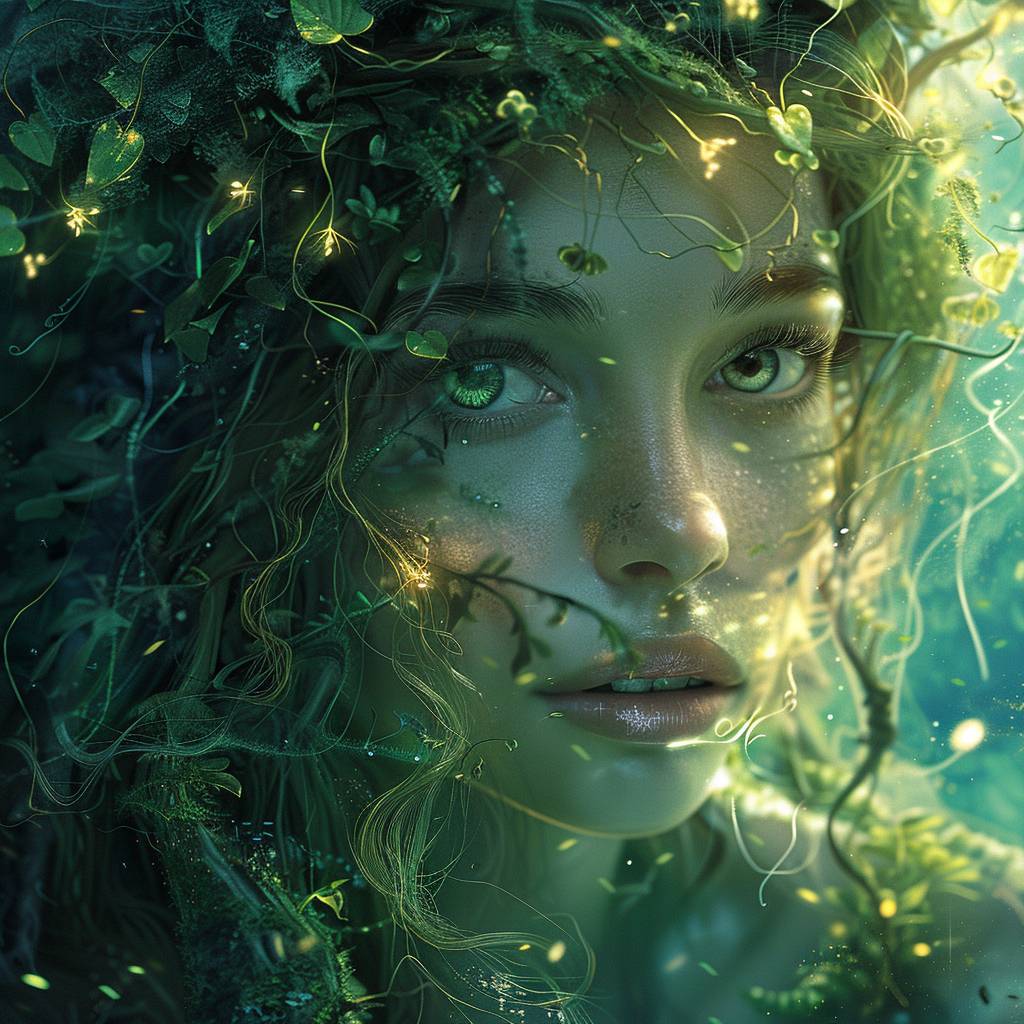森のエッセンスを体現した女性の穏やかで魔法のような肖像を描いてください。肌は微妙な緑がかっていて、髪は葉、花、つると絡み合っています。
