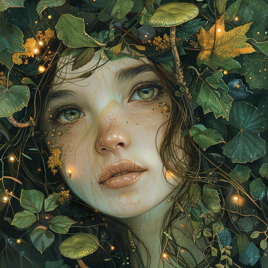 Ethereal Forest Nymph: Illustrate a serene and magical portrait of a woman who embodies the essence of the forest. Her skin has a subtle greenish tint, and her hair is intertwined with leaves, flowers, and vines. Her eyes glow softly, reflecting the light of the moon. The background features a mystical forest with ancient trees, glowing fungi, and fireflies. Style=Ethereal, Magical --style raw --stylize 300 --v 6.0