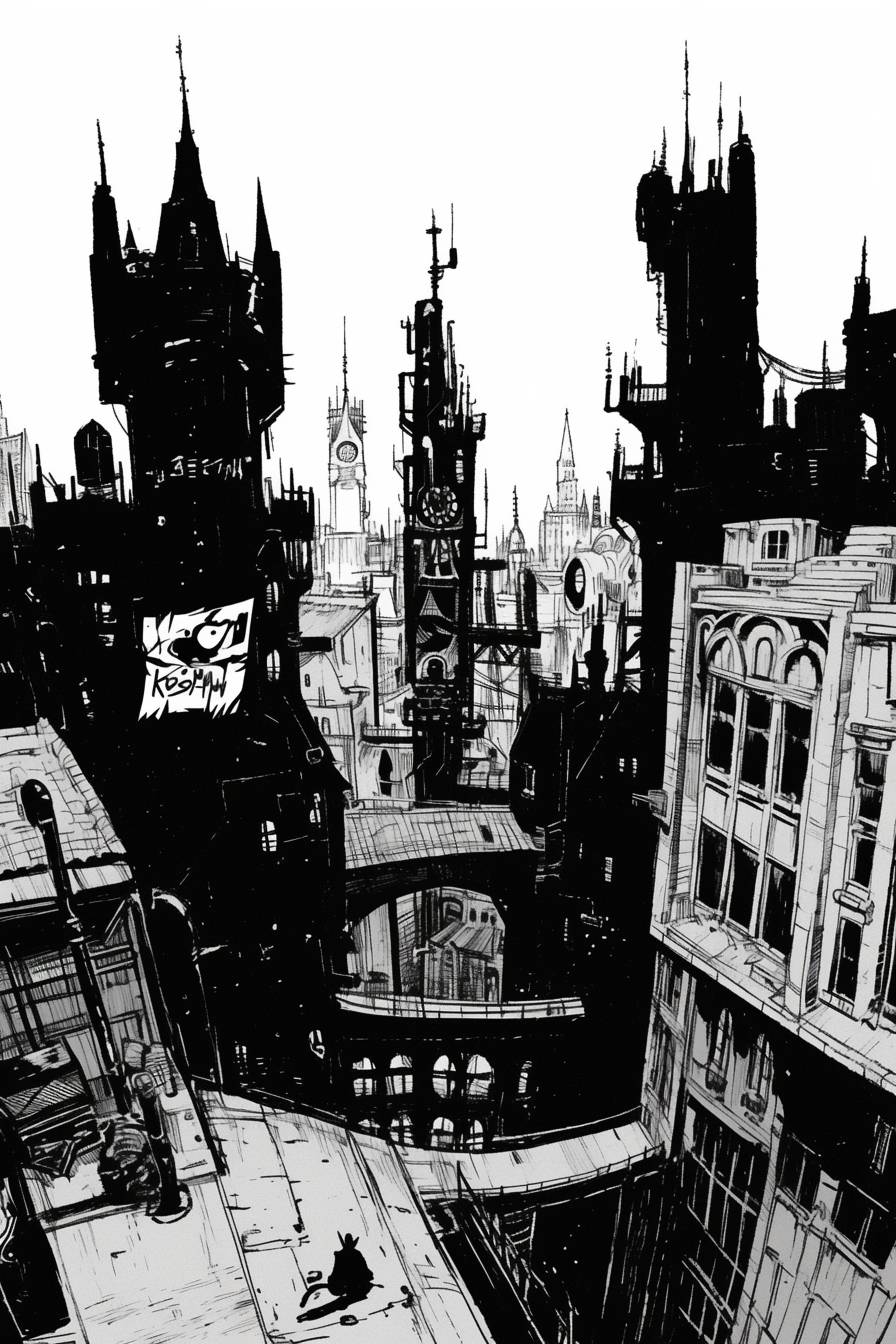 manga-style urbanscape of 19th century steampunk megacity --sref 3783066734 --niji 6 --ar 2:3 --style raw
