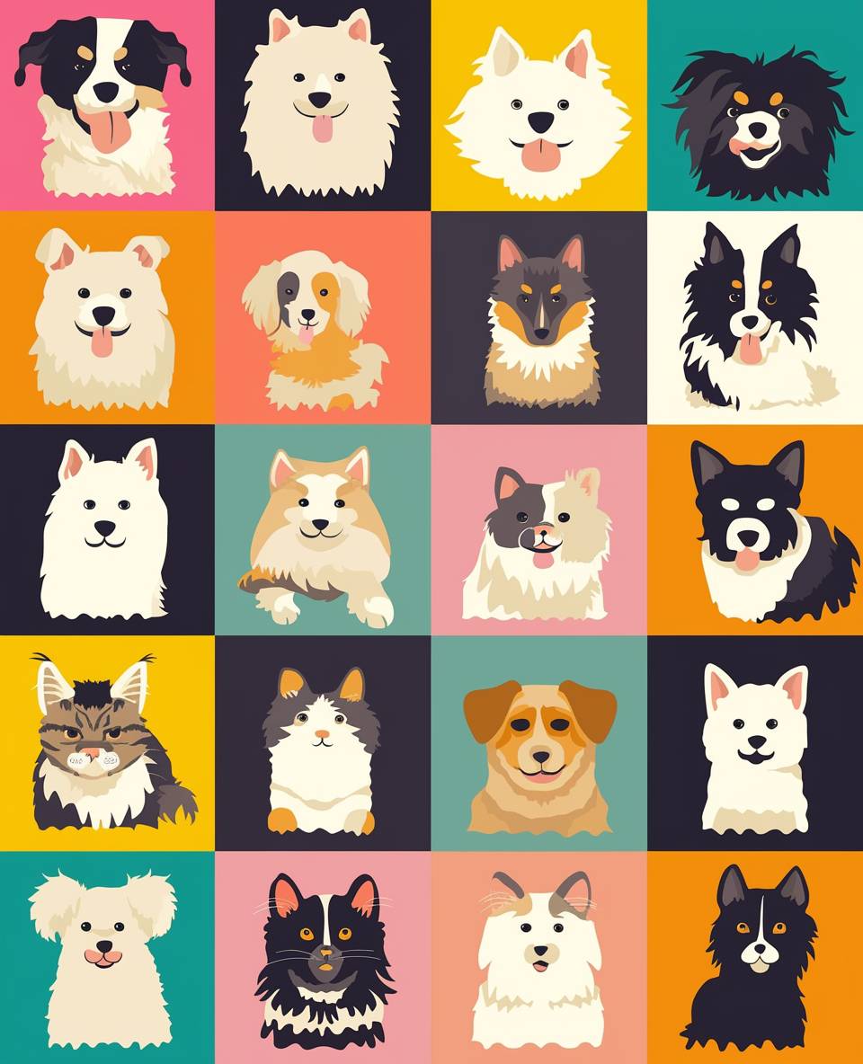 A colorful poster with square shapes in different colors, each containing dogs and cats head portraits. The images should be simple and cute, suitable for children's artwork or wall art design. Each shape is filled with vibrant shades of pink, blue, green, yellow, orange, purple, red, white, black, brown, grey, beige. There will be no text on the posters; instead, they have large blank spaces where you can add your own messages to generate unique designs that fit well into fun home decor. --ar 75:92 --style raw --niji 6