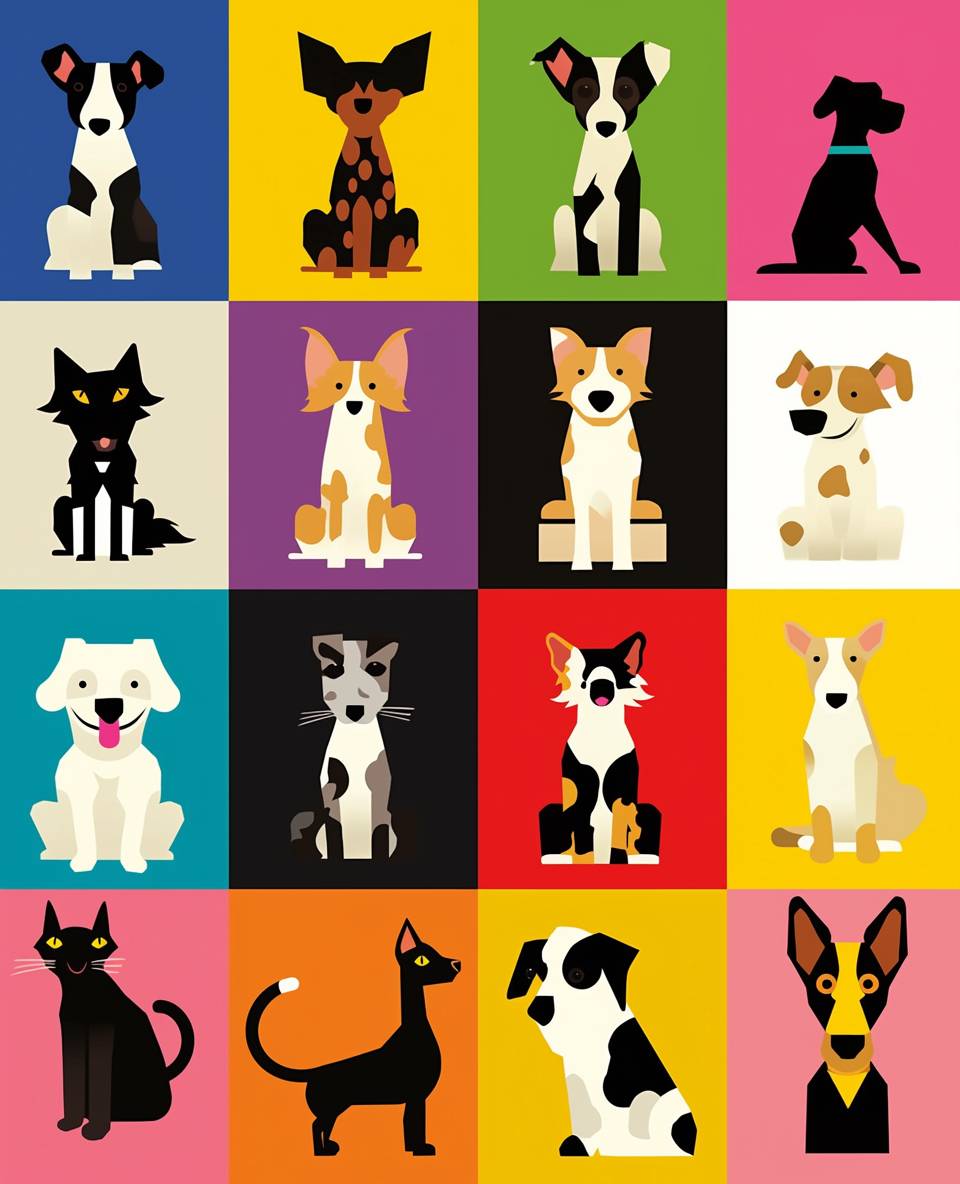 異なる色の四角形が描かれたカラフルなポスターで、それぞれに犬と猫の頭部のポートレートが含まれています。画像はシンプルでかわいく、子供のアート作品やウォールアートのデザインに適しています。各形状は、鮮やかなピンク、青、緑、黄色、オレンジ、紫、赤、白、黒、茶色、グレー、ベージュで満たされています。ポスターにはテキストはなく、大きな空白のスペースがあるので、自分のメッセージを追加して、楽しいホームデコレーションに適したユニークなデザインを生成できます。