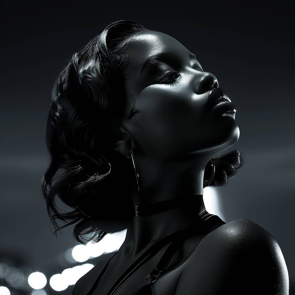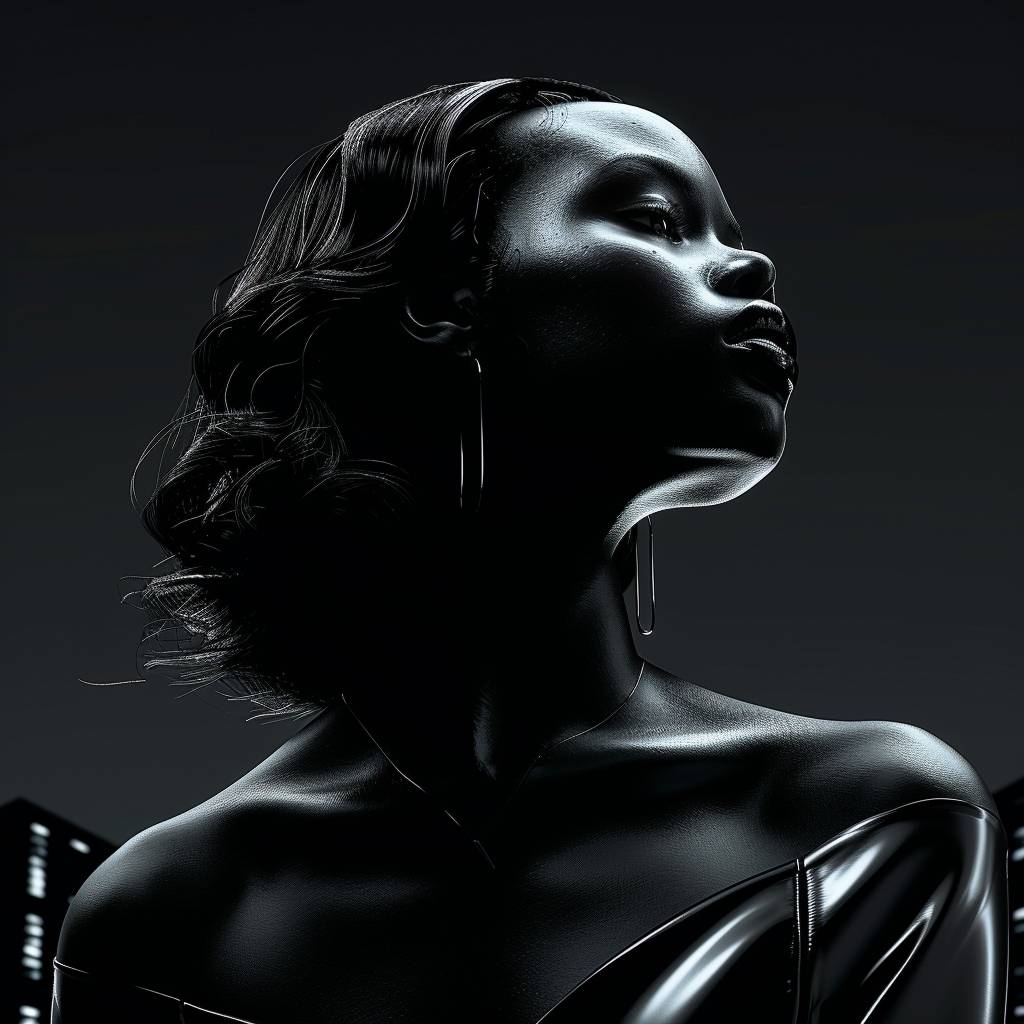 夜、屋上で美しい黒人女性が街の灯りを見つめ、緊張感のある雰囲気を漂わせています。