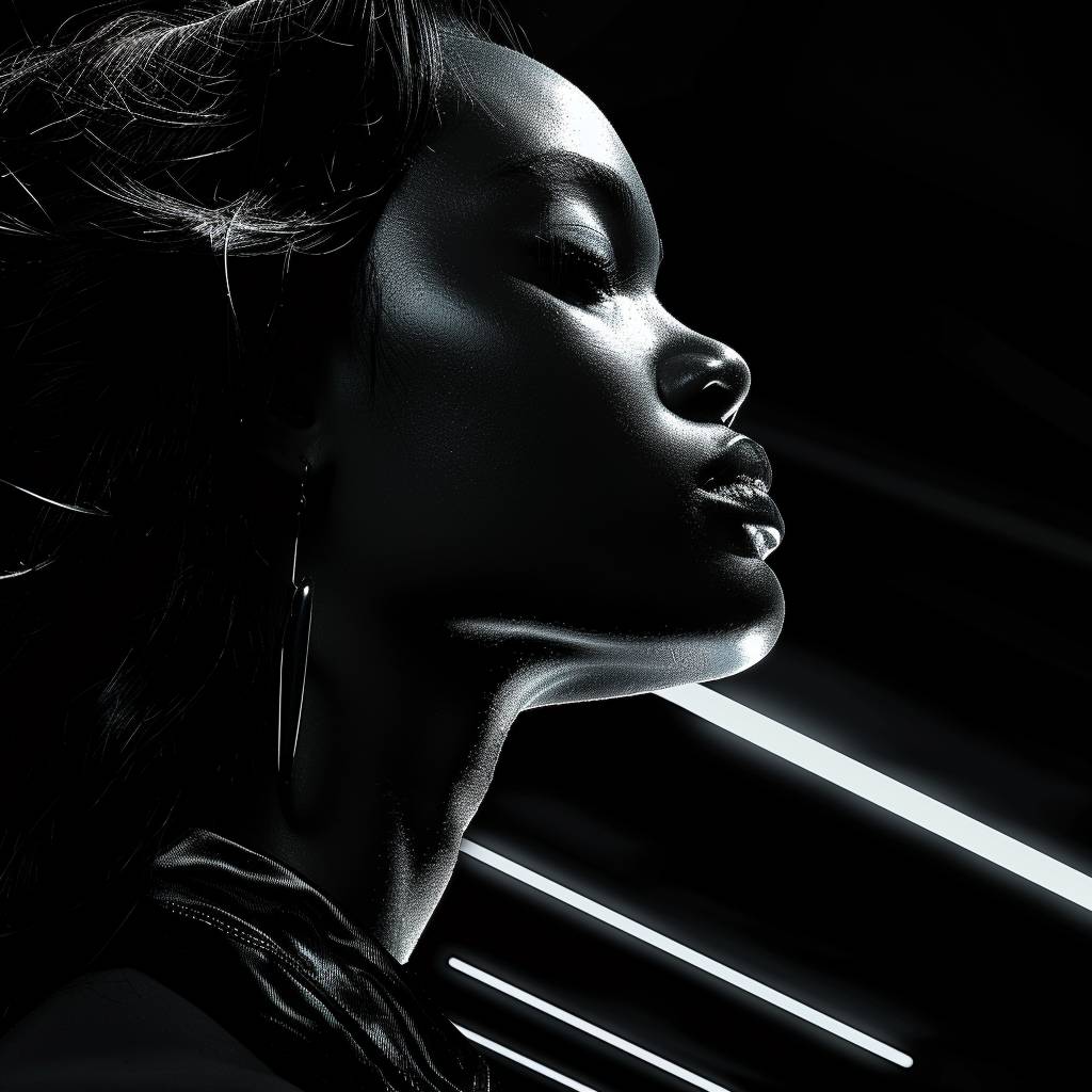 美しい黒人女性、肩までの波状の髪、夜、街の明かりを見つめている、人工街灯によるドラマチックな照明、中距離、二色調、ターコイズと赤、緊張した雰囲気、Cinestill 50D、詳細な構図