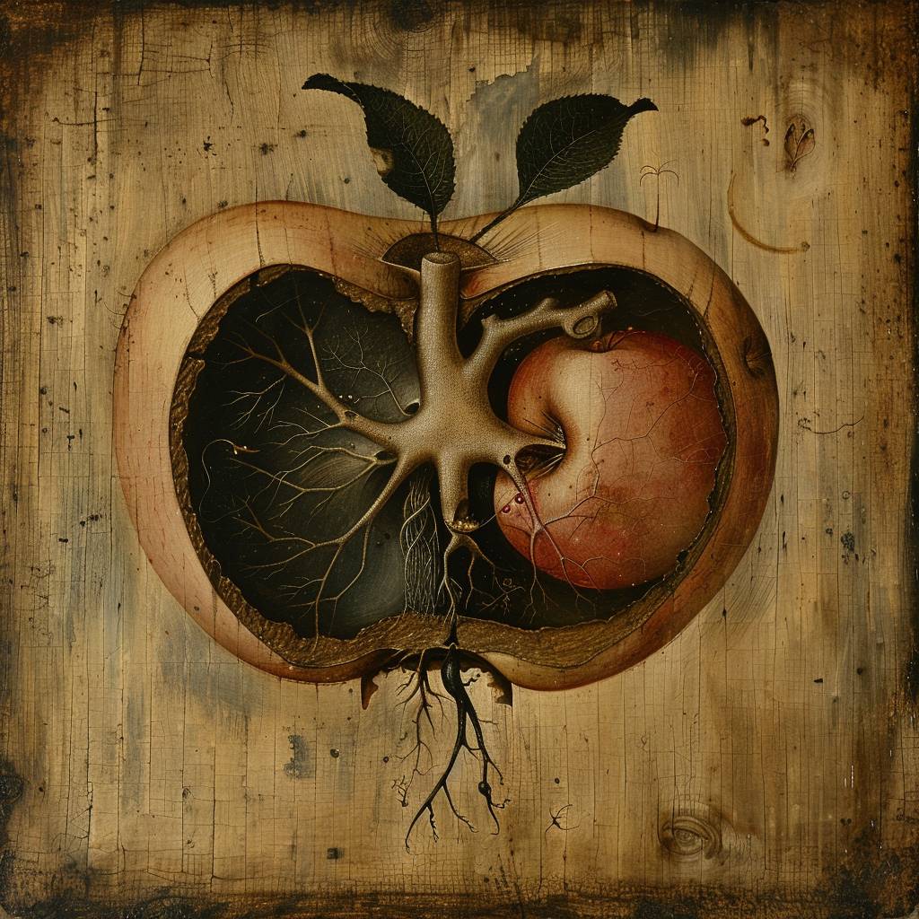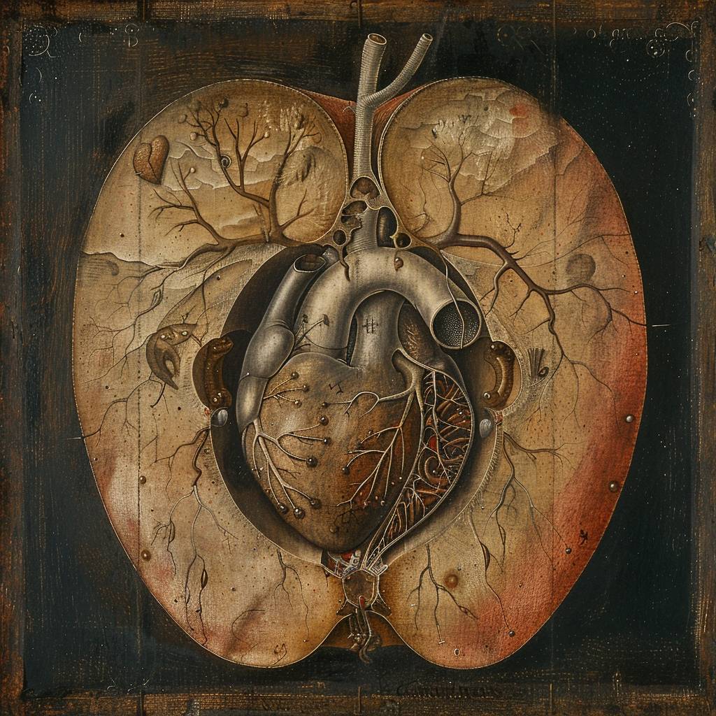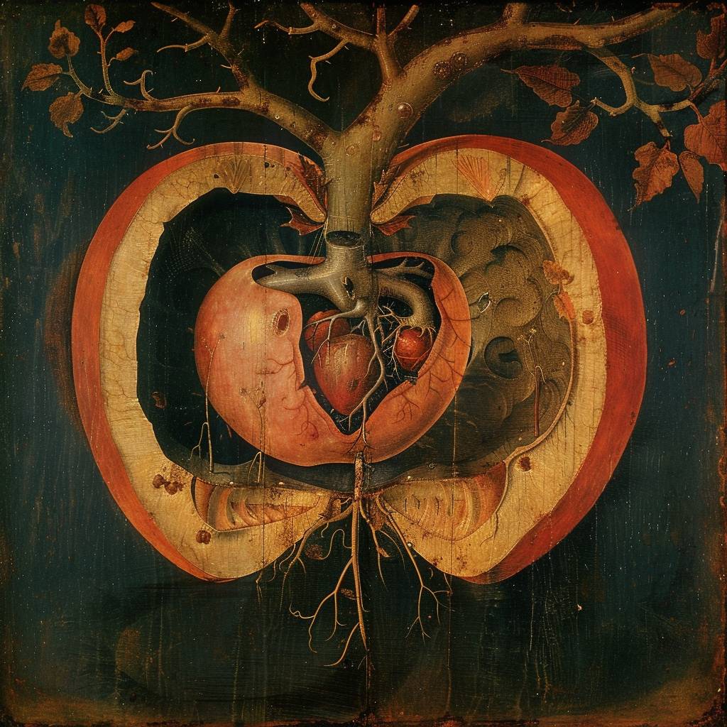 ヒエロニムス・ボスの絵画は、リンゴの内部と解剖学的な半分の心臓を描写しています。