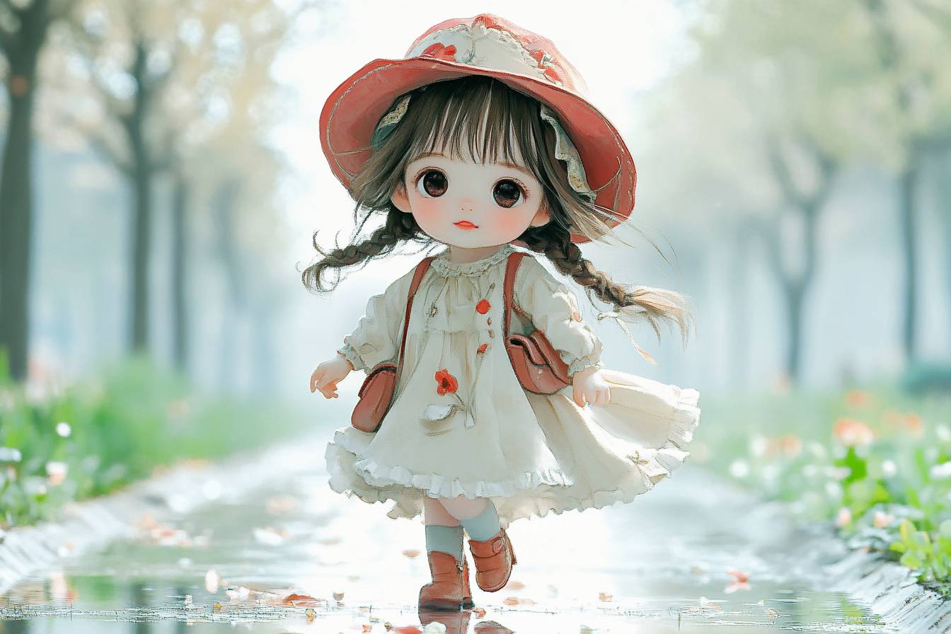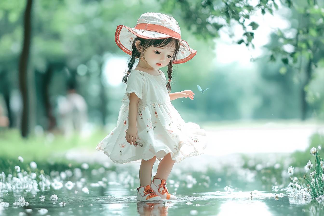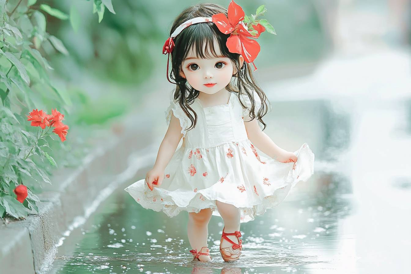 A beautiful little girl is walking on a puddle. --sref 3903064779 --ar 3:2 --v 6.1