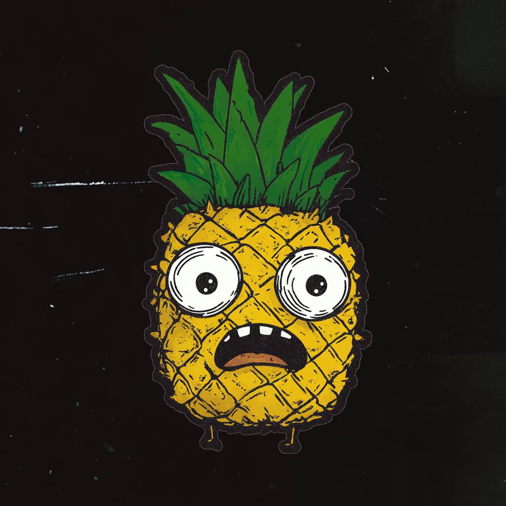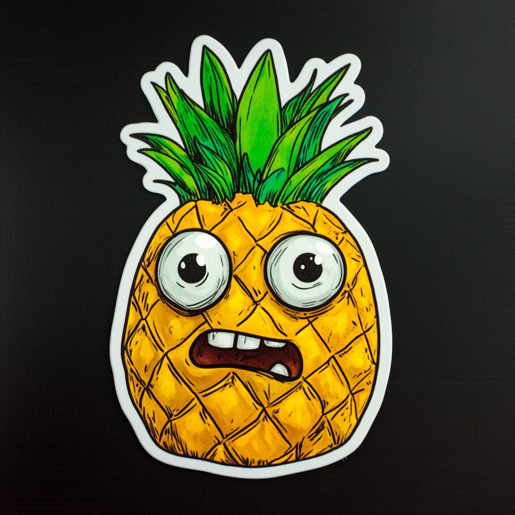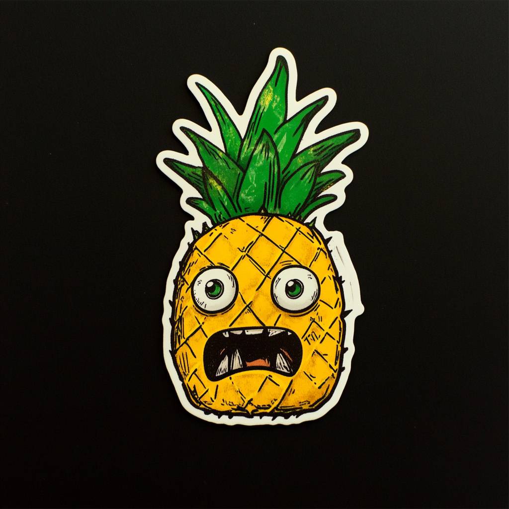 疲れたパイナップルのステッカー、大きな目と大きな口、ミームスタイル、黄色と緑、黒い背景に貼られています。