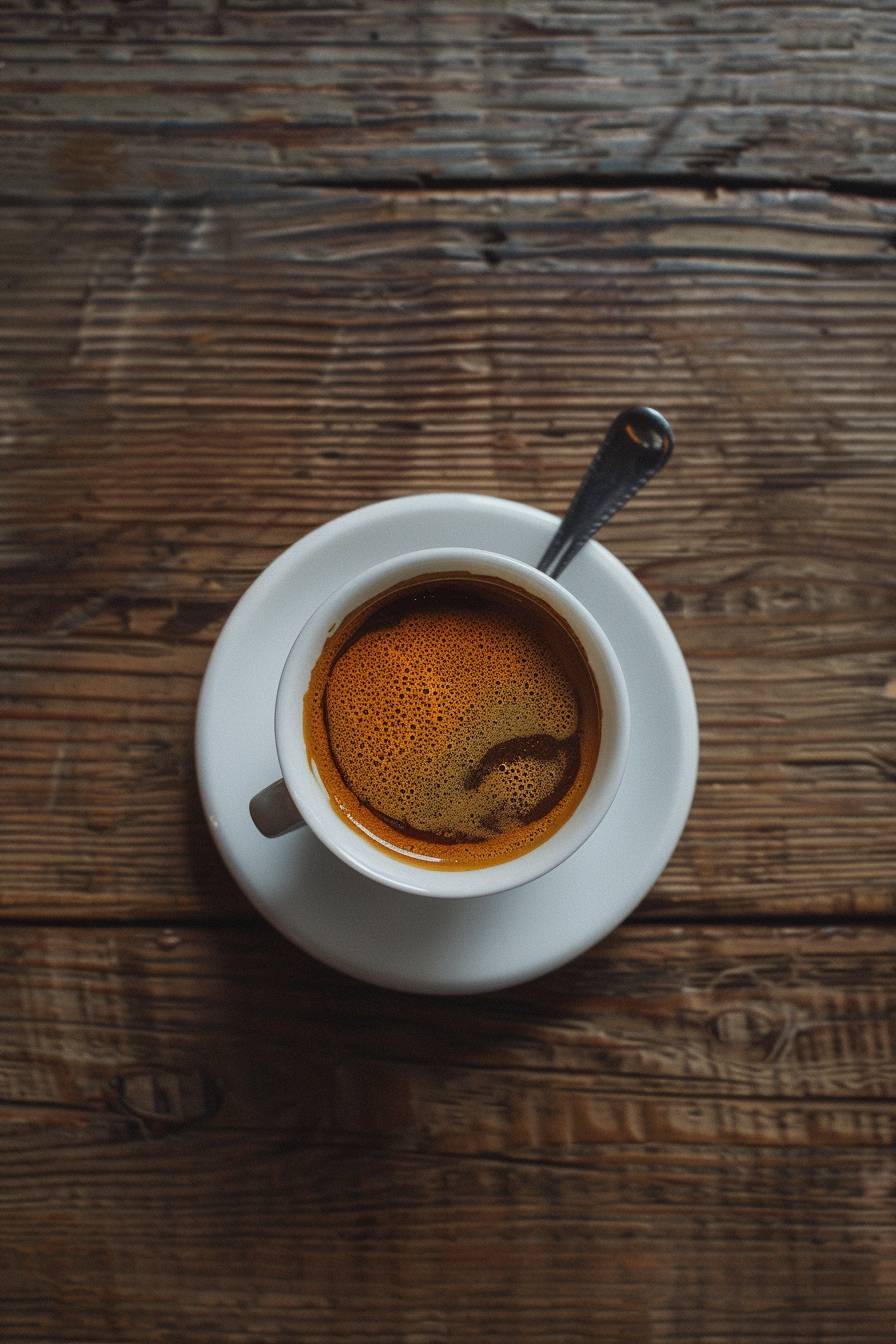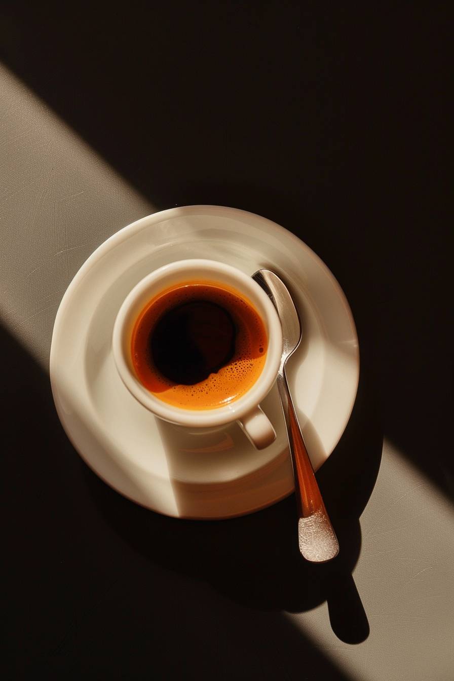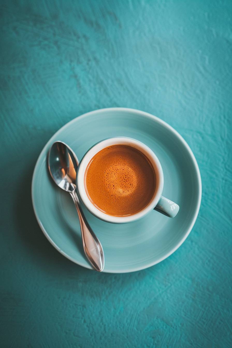 espresso cup with spoon in saucer, wes anderson style, hyper realistic, photo,Camera Flash,minimal,kitsch, birds eye view, overhead perspective photo, eye level, 4k --ar 2:3 --v 6.0