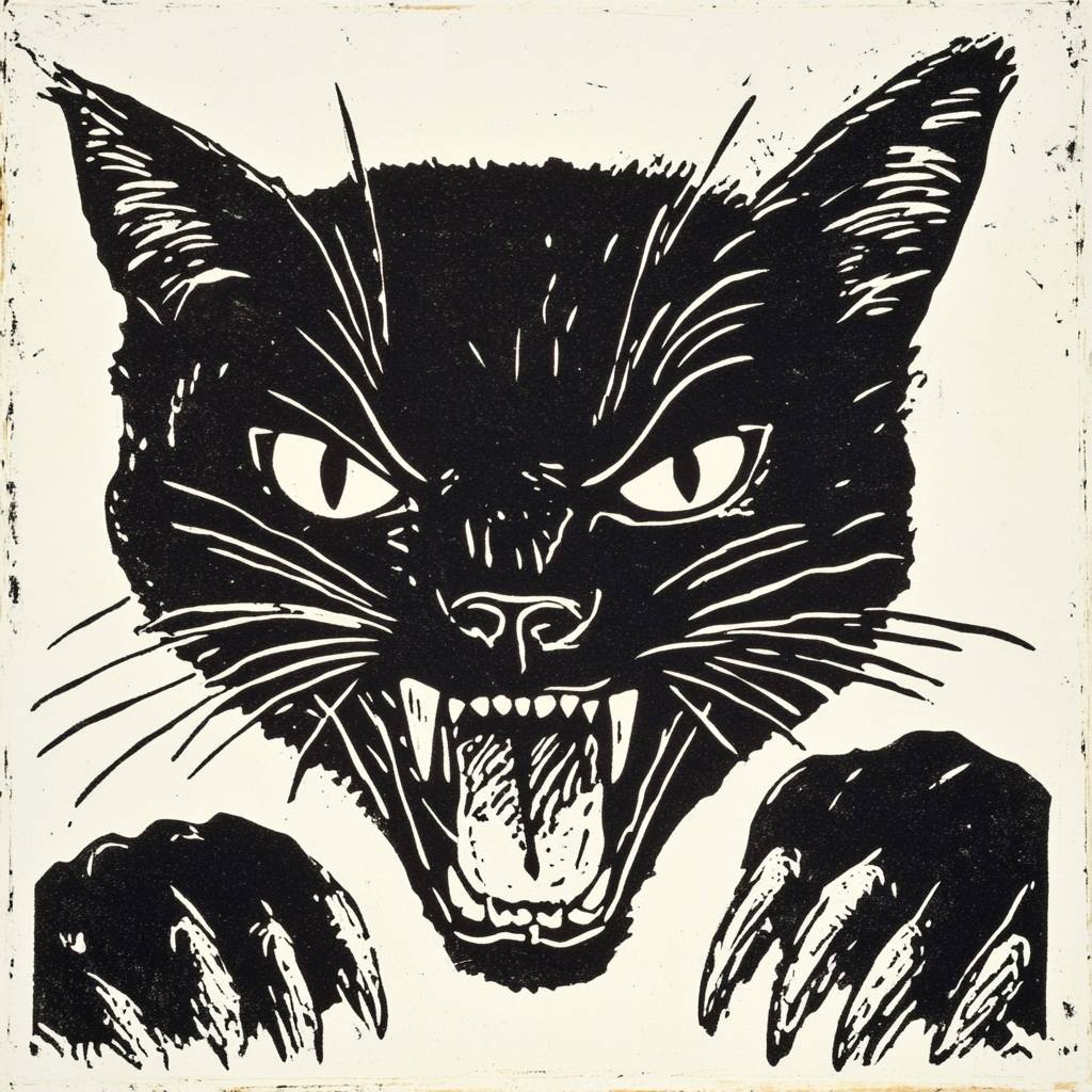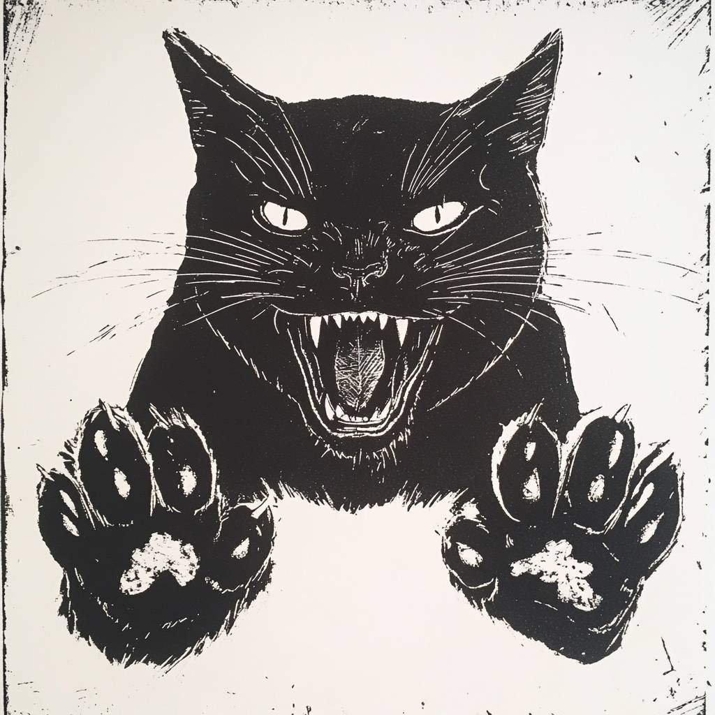 a block print of the face and front paws of a fierce, angry black cat with its mouth open and its claws out on a white background --v 6.1