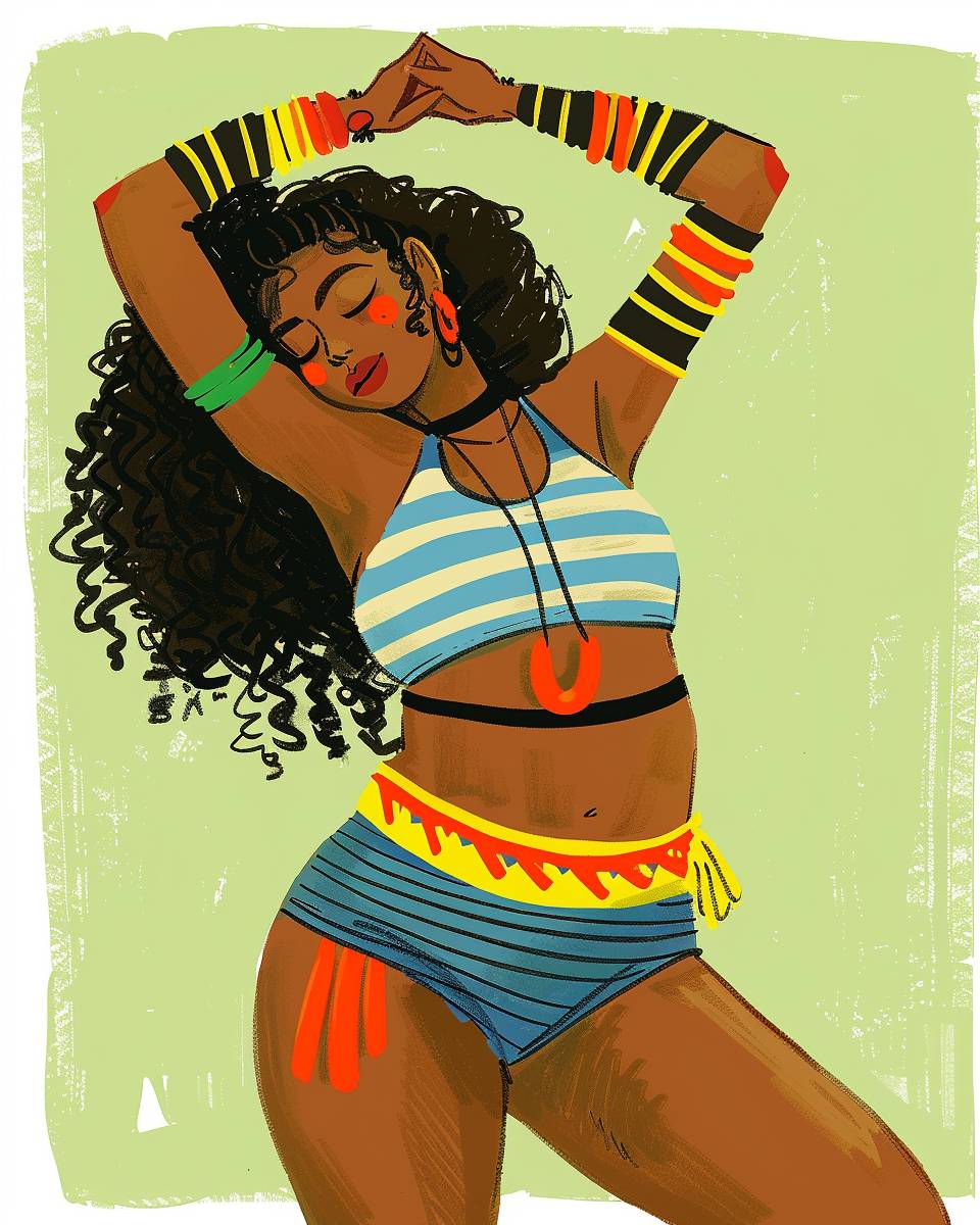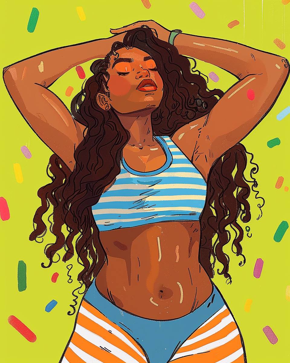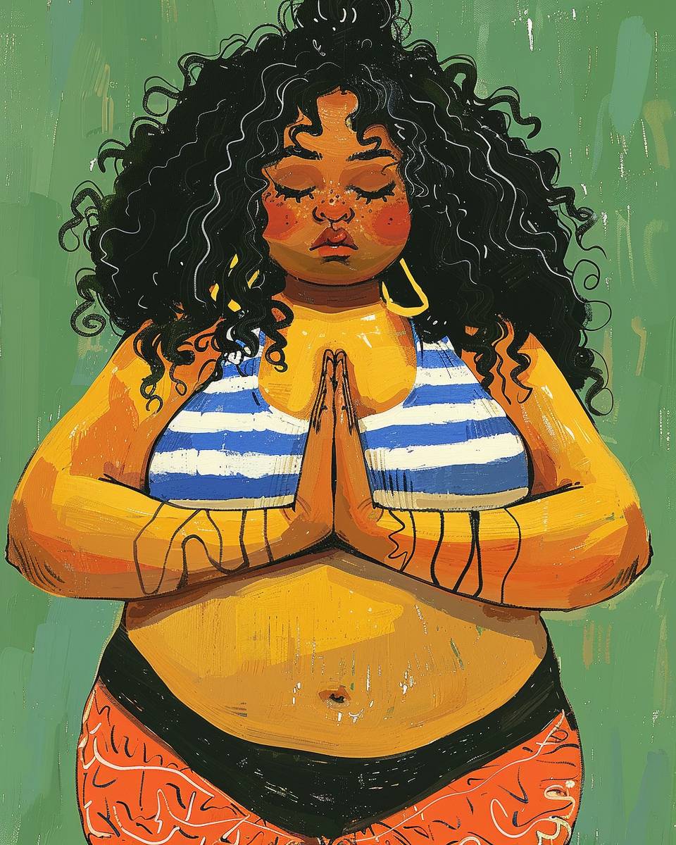 太った女性のイラストで、青と白のストライプのトップを着て、ヨガをし、腕を伸ばし、一方の足を曲げています。彼女のポーズはカジュアルでありながら力強く、平面的なコミックカラー、太い線、鮮やかな色、シンプルなディテール、ミニマリスティックなスタイルです。