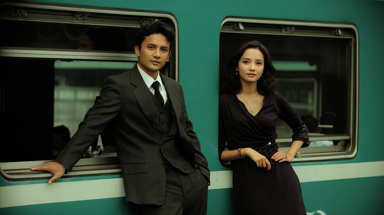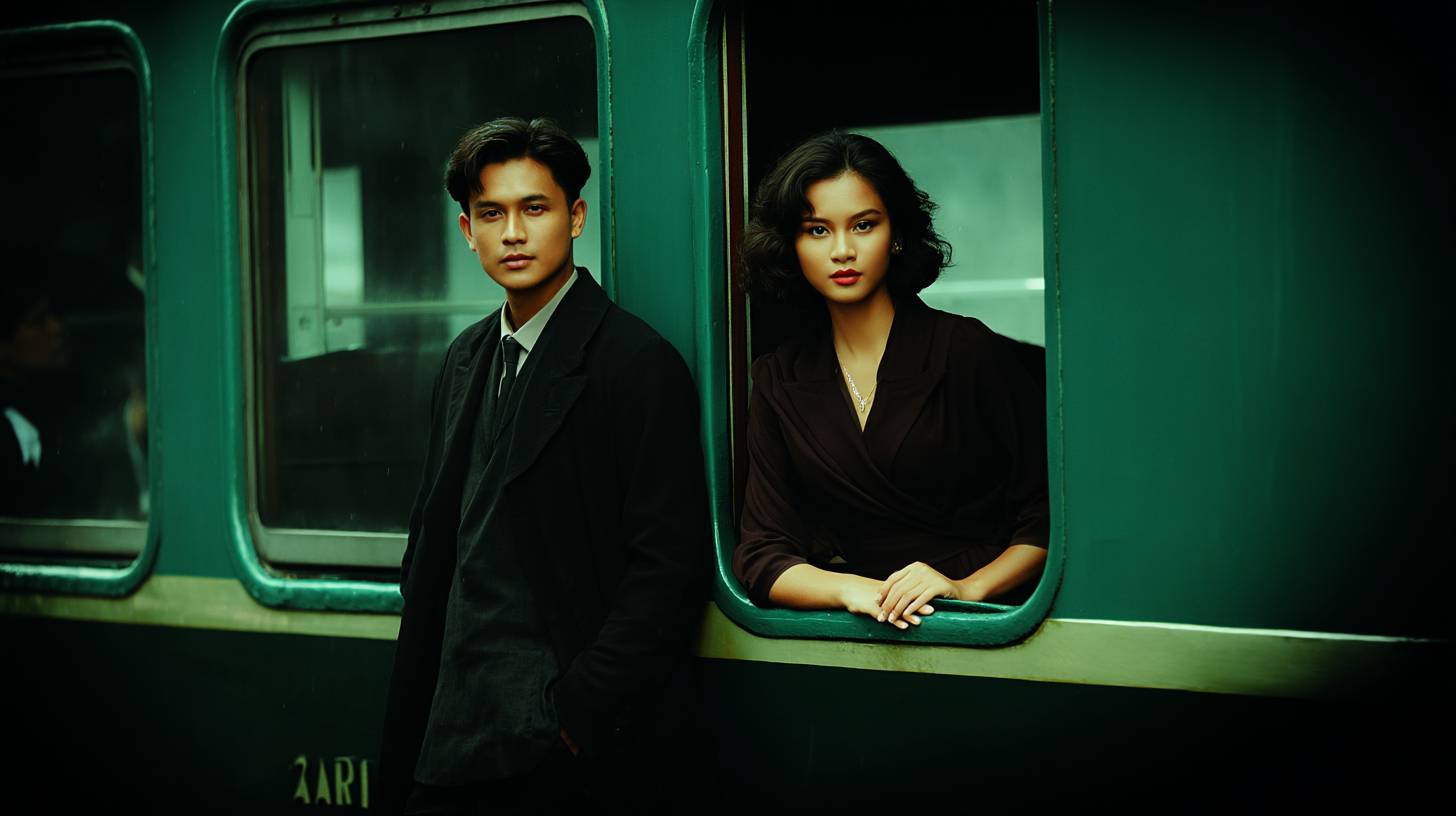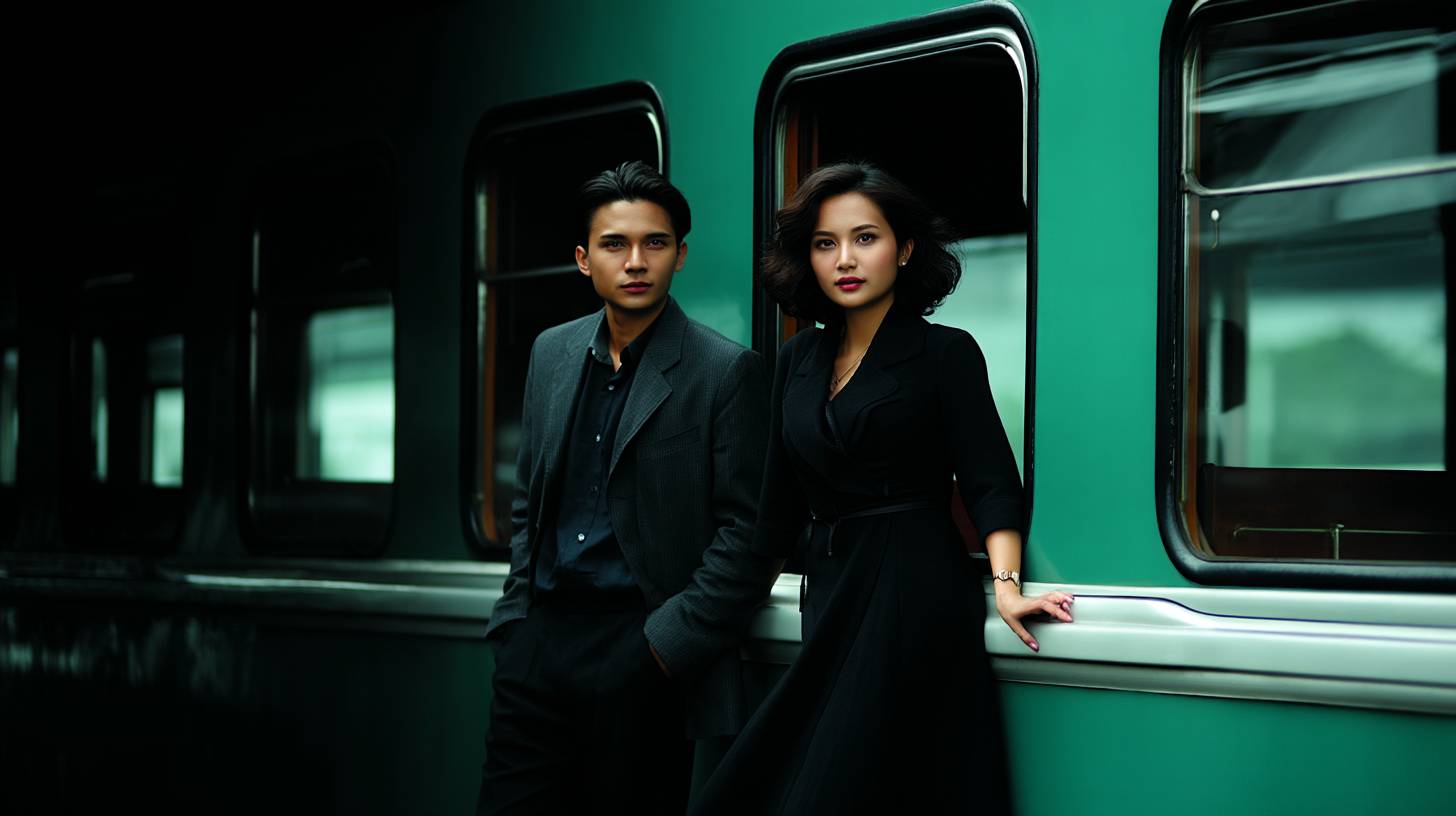 ARRI Alexa. Close-up cinematic people on a green vintage train, two looking out from each of the two large windows. On the left window: an Indonesian handsome young man leaning on the train window frame with a thoughtful face. On the right window: an oriental young woman with shoulder-length black hair resting her arms on the window frame, looking distant and melancholic. Warm morning light, slightly muted colors, clear focus and soft depth of field, symmetrical composition, poster design aesthetic, Chinese and Indonesian elements subtly blended. Hyper realistic photo. --ar 16:9 --v 7.0 --s 750 --p semv7u6