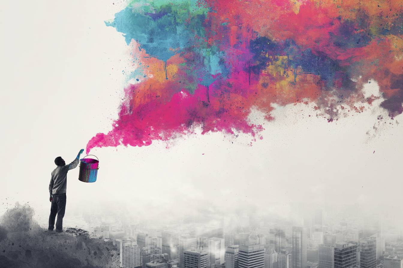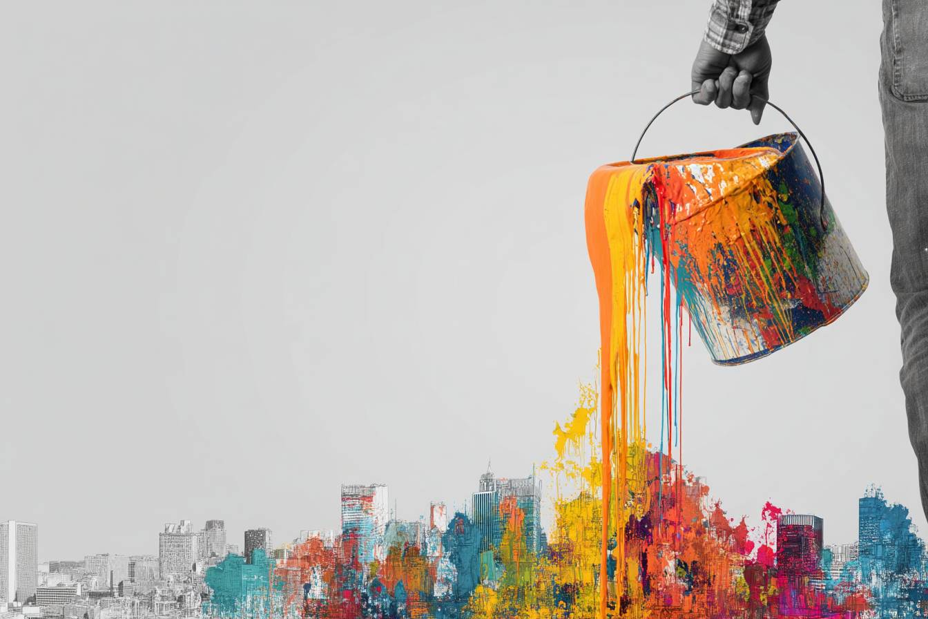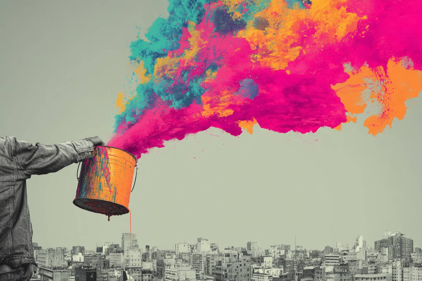 男がバケツで明るいペイントを灰色の街の風景に注ぎ、創造性と希望のメタファーとしてのカラーフィナーレ。