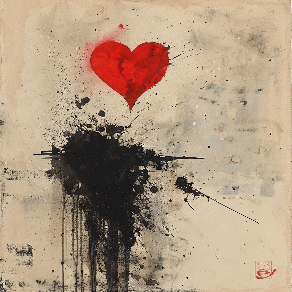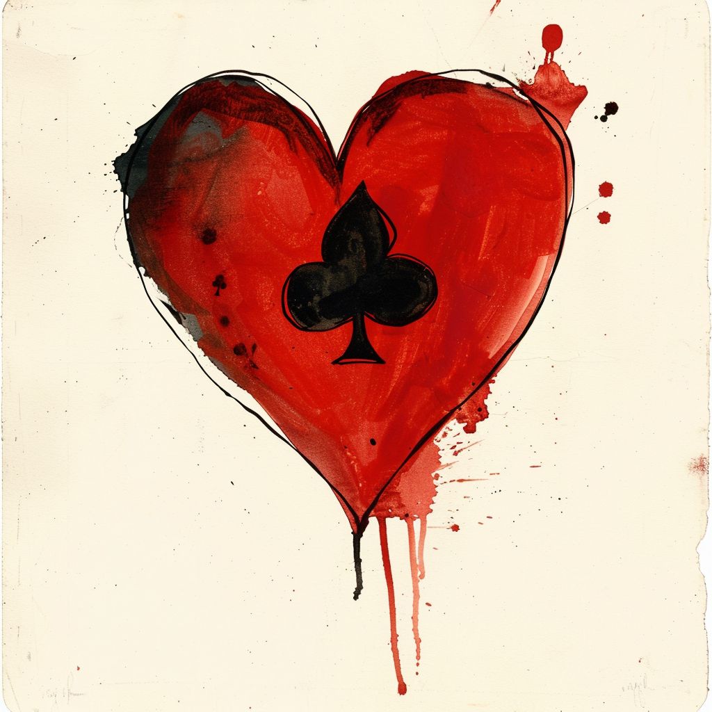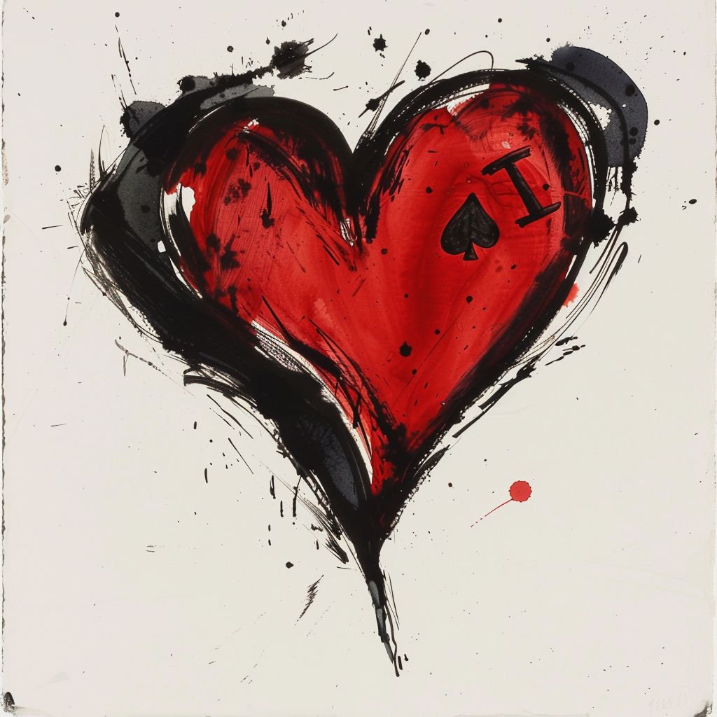 ミニマリストの墨絵が赤いハートのKのトランプの本質を捉えており、30未満の大胆で表現力豊かな筆致で文人画スタイルを用いています。その形は流動的で抽象的であり、描写するのではなく、さりげなく提示し、流れる黒い墨でトランプの形を outline しています。