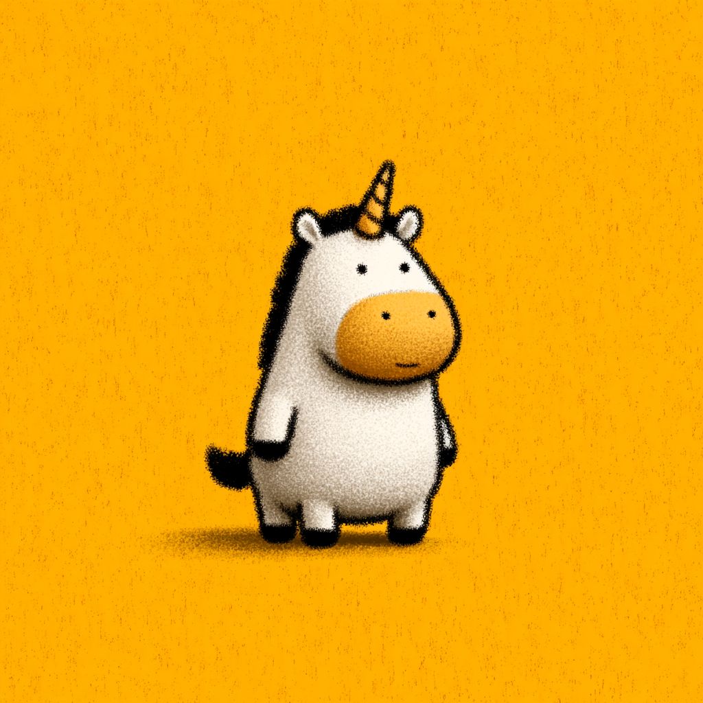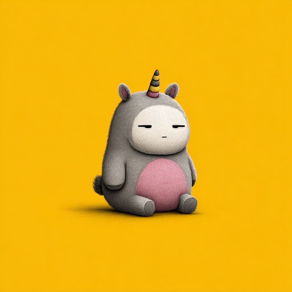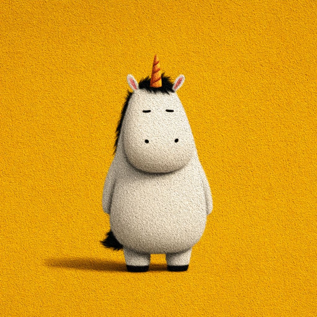 大胆で禅のスタイルのぽっちゃりユニコーンキャラクター、ピクサー風で、シンプルでフラットなデザイン、黄色の背景。デザインはミニマリストで、かわいくてふわふわした外観を作るためにシンプルな形を使っています。背景はシンプルで、カラースキームもシンプルでかわいいです。