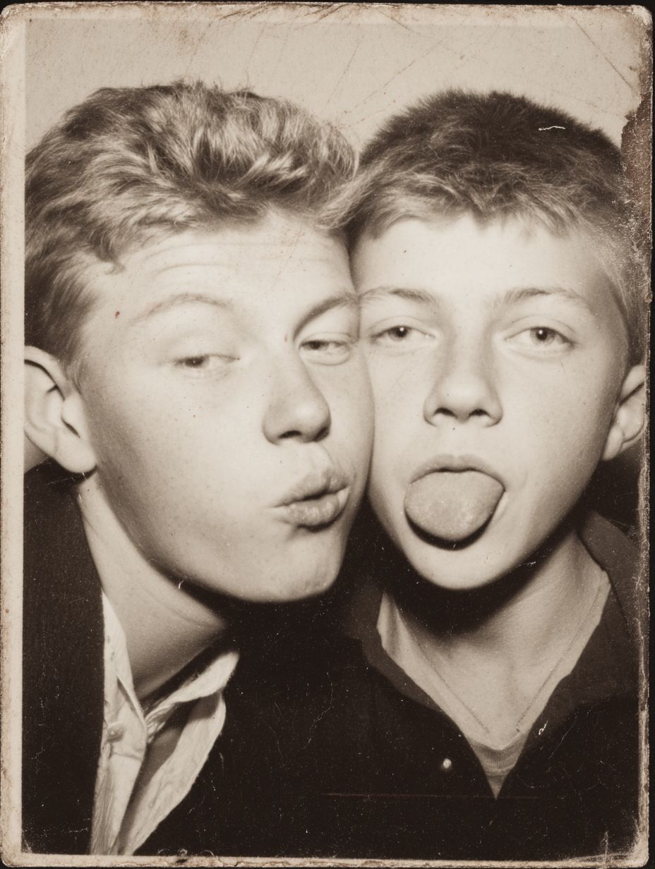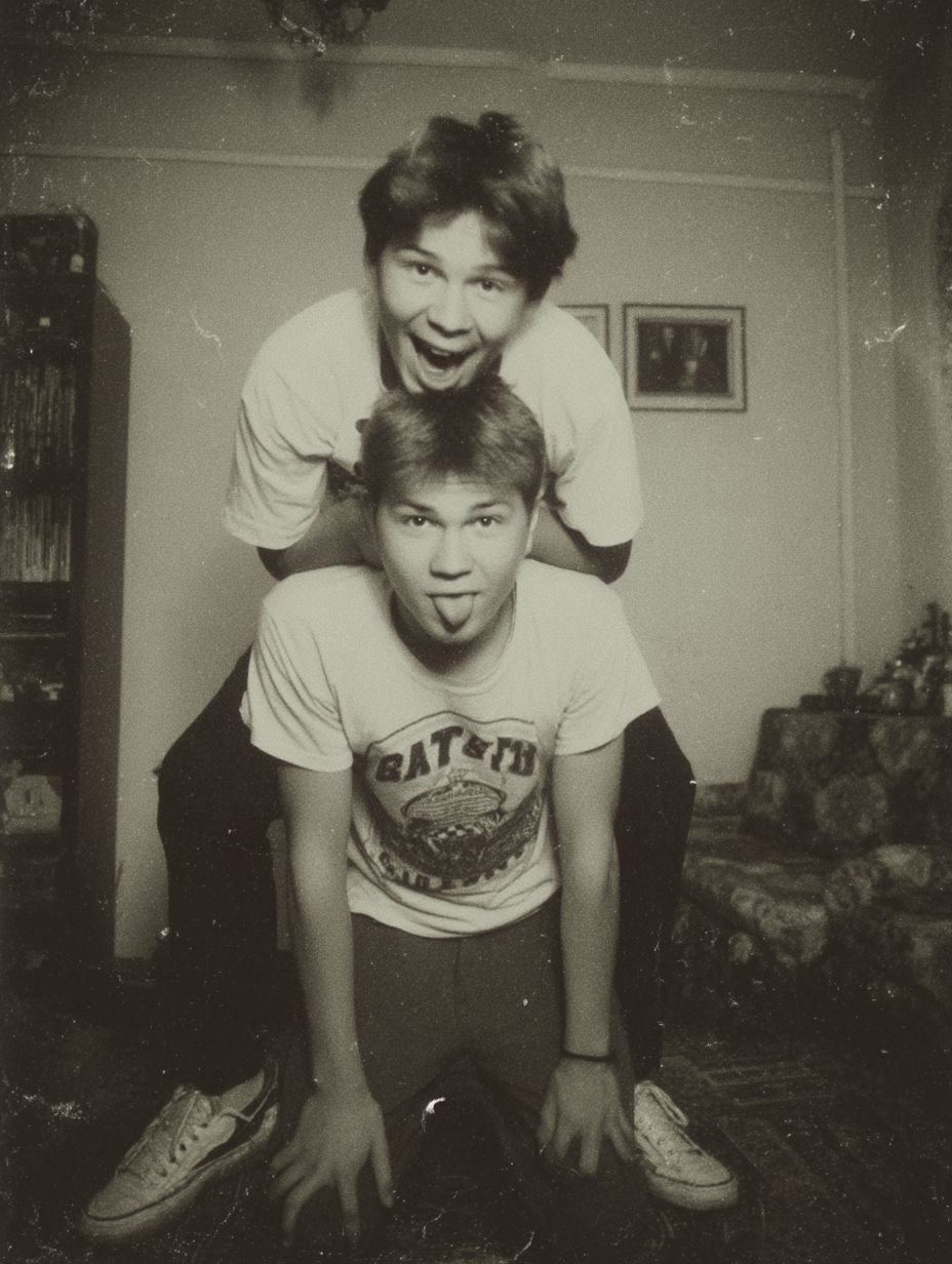 old photo taken on old photoporta, two teenagers, brothers fooling around at home. was taken in 1984 --ar 3:4 --v 7.0