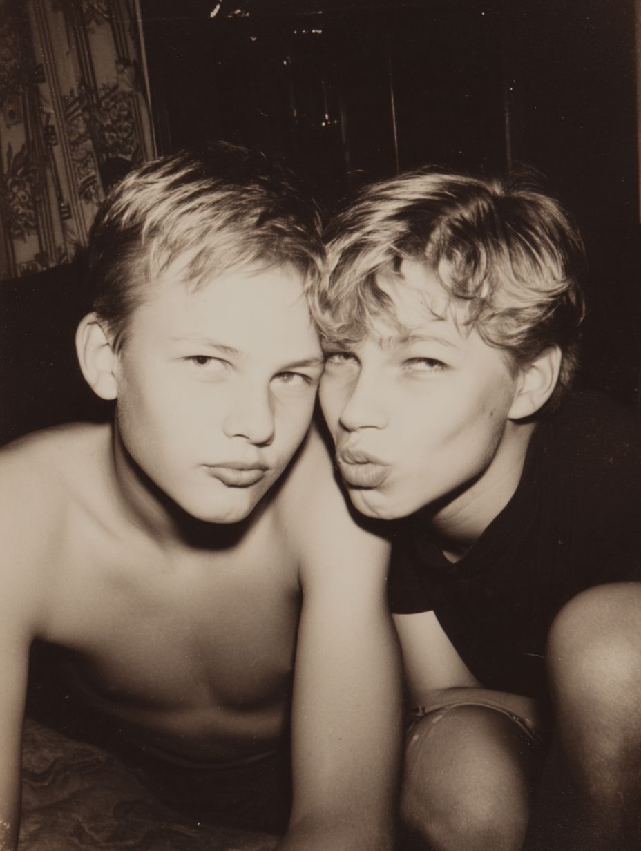 これは1984年に撮影された古い写真で、2人のティーンエイジャーの兄弟が家でふざけあっています。