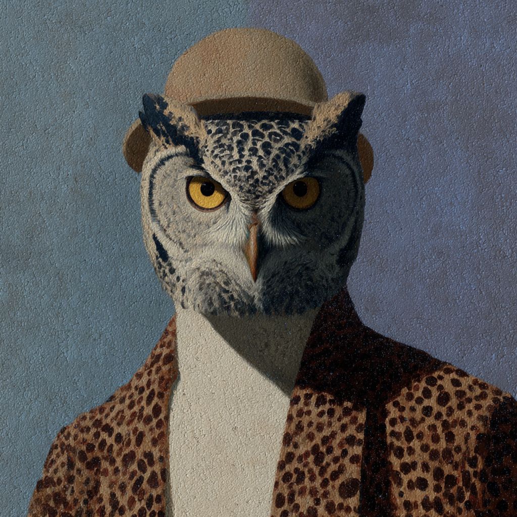 primitive owl in the style of René Magritte --exp 50 --profile de3r2pp --v 7.0