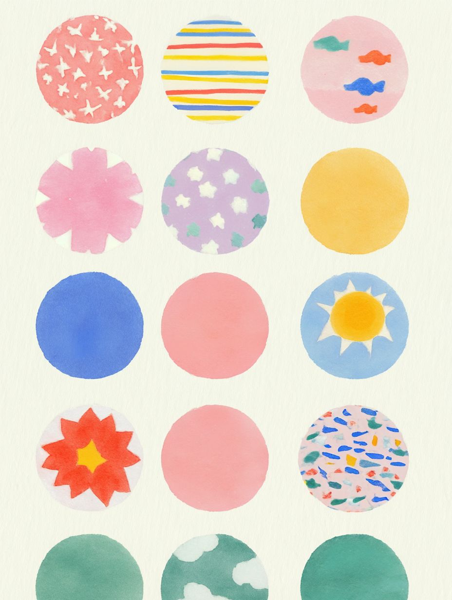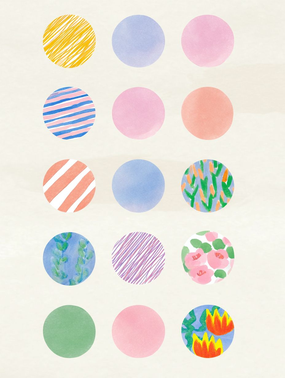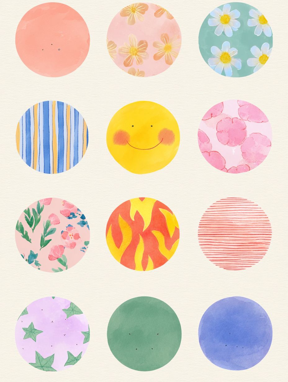さまざまなパターンが描かれたかわいい手描きの円形ステッカーのコレクション、ストライプ、落書きのライン、花柄、スマイリーフェイス、炎の形などがあり、単色のパステルまたは白い背景の上に整然と並んでいます。星はシンプルな落書きスタイルで描かれ、パステルイエロー、ライトオレンジ、ピンク、ラベンダー、スカイブルー、ミント、グレーがかった緑のような明るく柔らかい色調で表現されています。カートゥーンのフラットイラスト、ミニマリストで子供のような美学。
