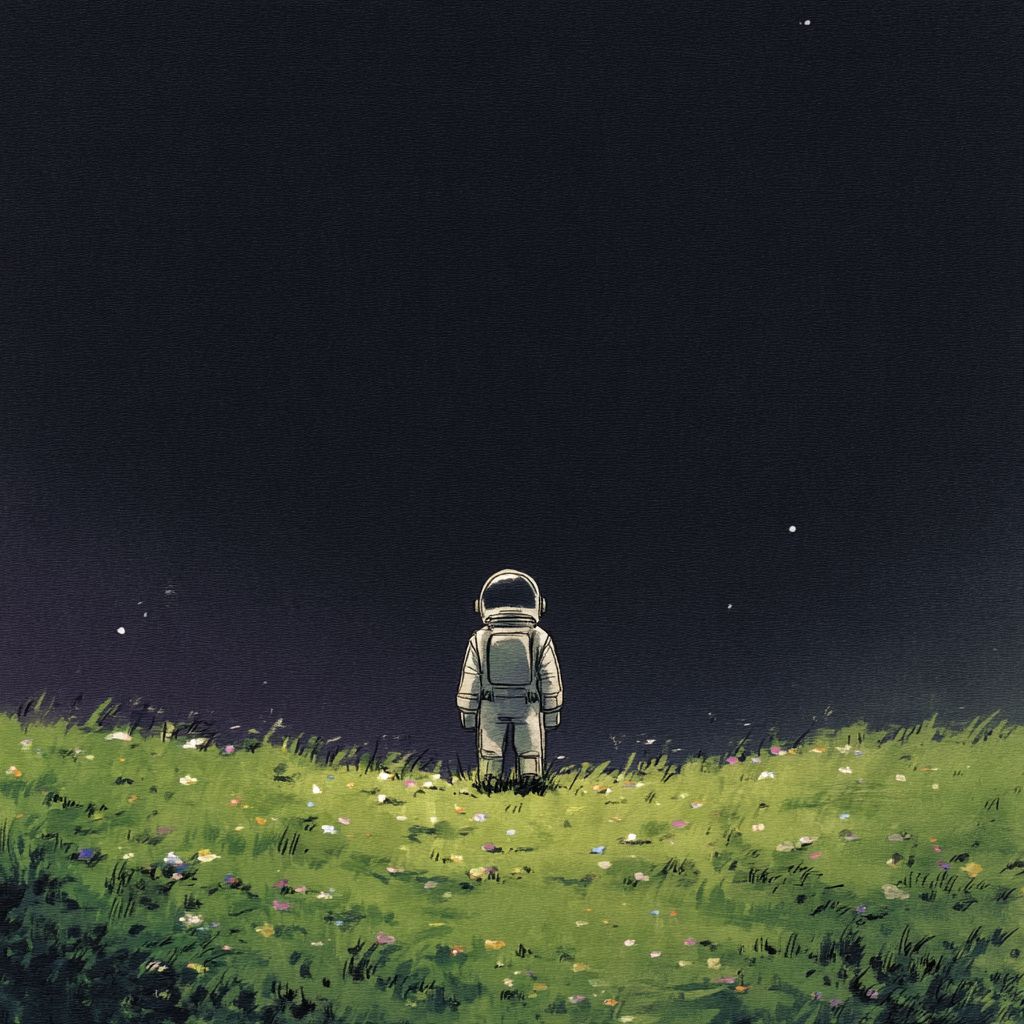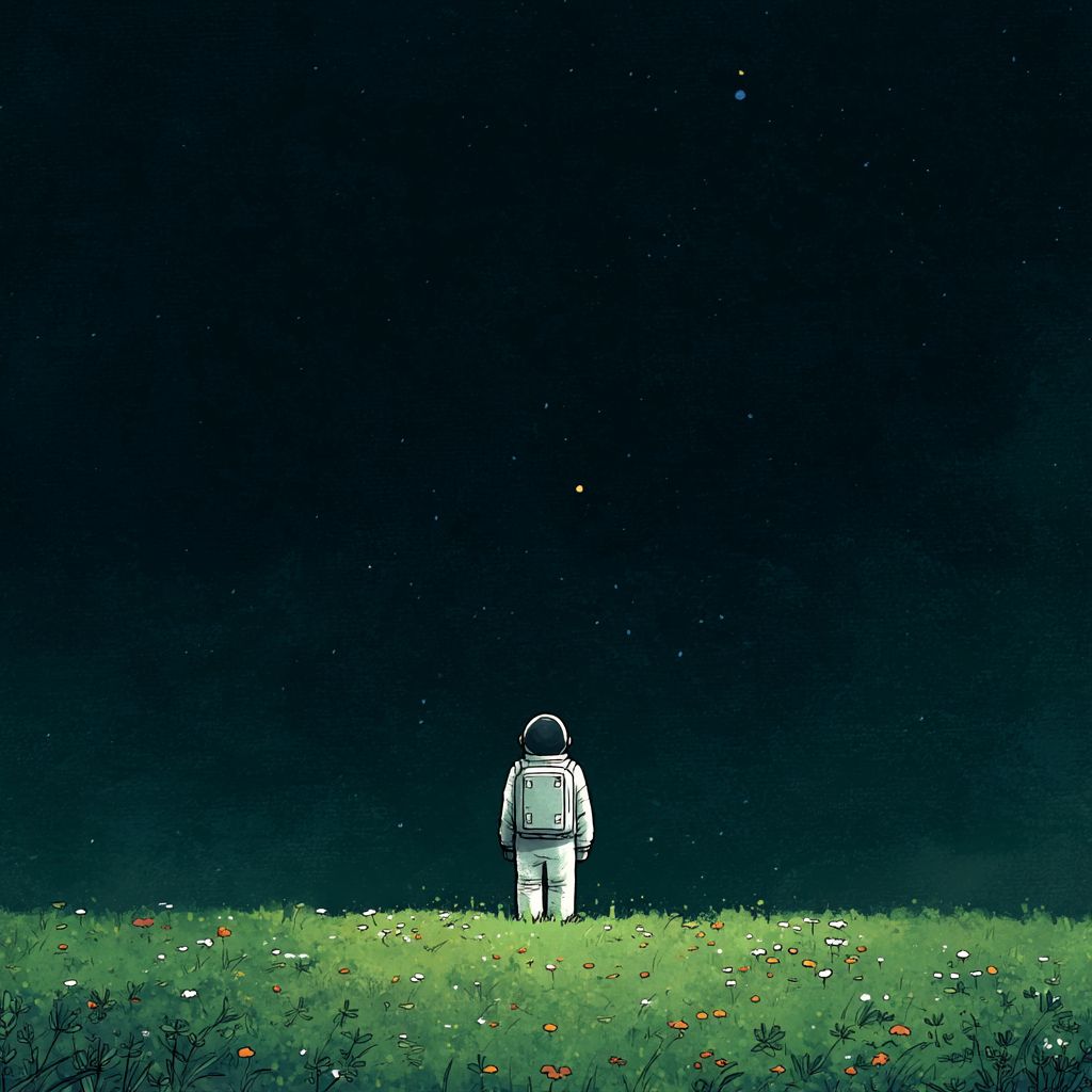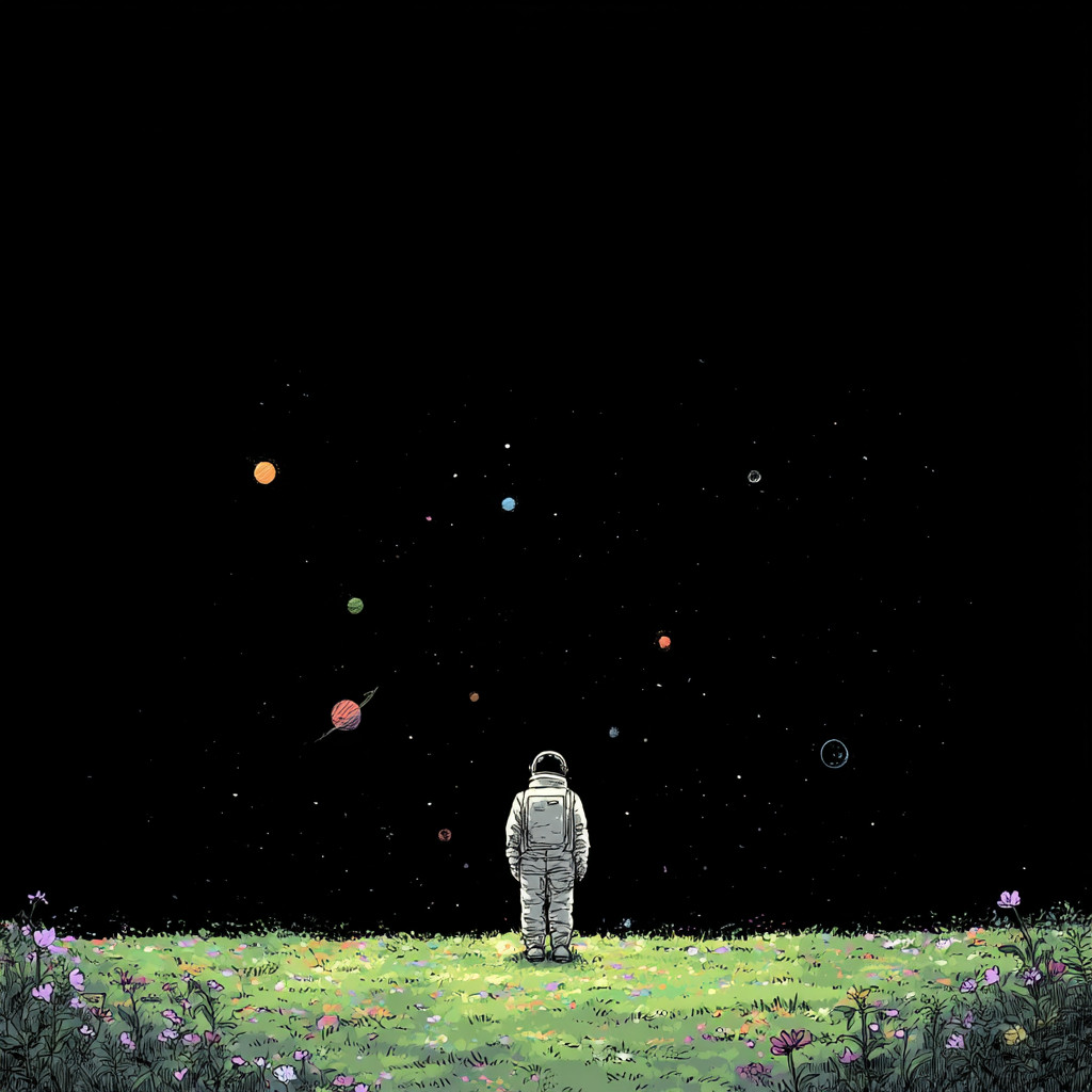 宇宙飛行士が小さな花で覆われた緑の芝生の上に立っており、宇宙服を着ています。空は pitch black で、神秘的な宇宙のようです。柔らかく薄暗い舞台のライトが宇宙飛行士を照らしています。真っ黒な空には白い星、月、そしてさまざまな色の惑星があります。全体的な雰囲気は悲しみと孤独に満ちています。手描きの癒しのスタイルで、漫画家やアニメのようなミニマリズムです。メディアはクレヨンのようで、画像は遠くにあり、ダークな配色です。夢のような色で宇宙飛行士の背中を描いています。
